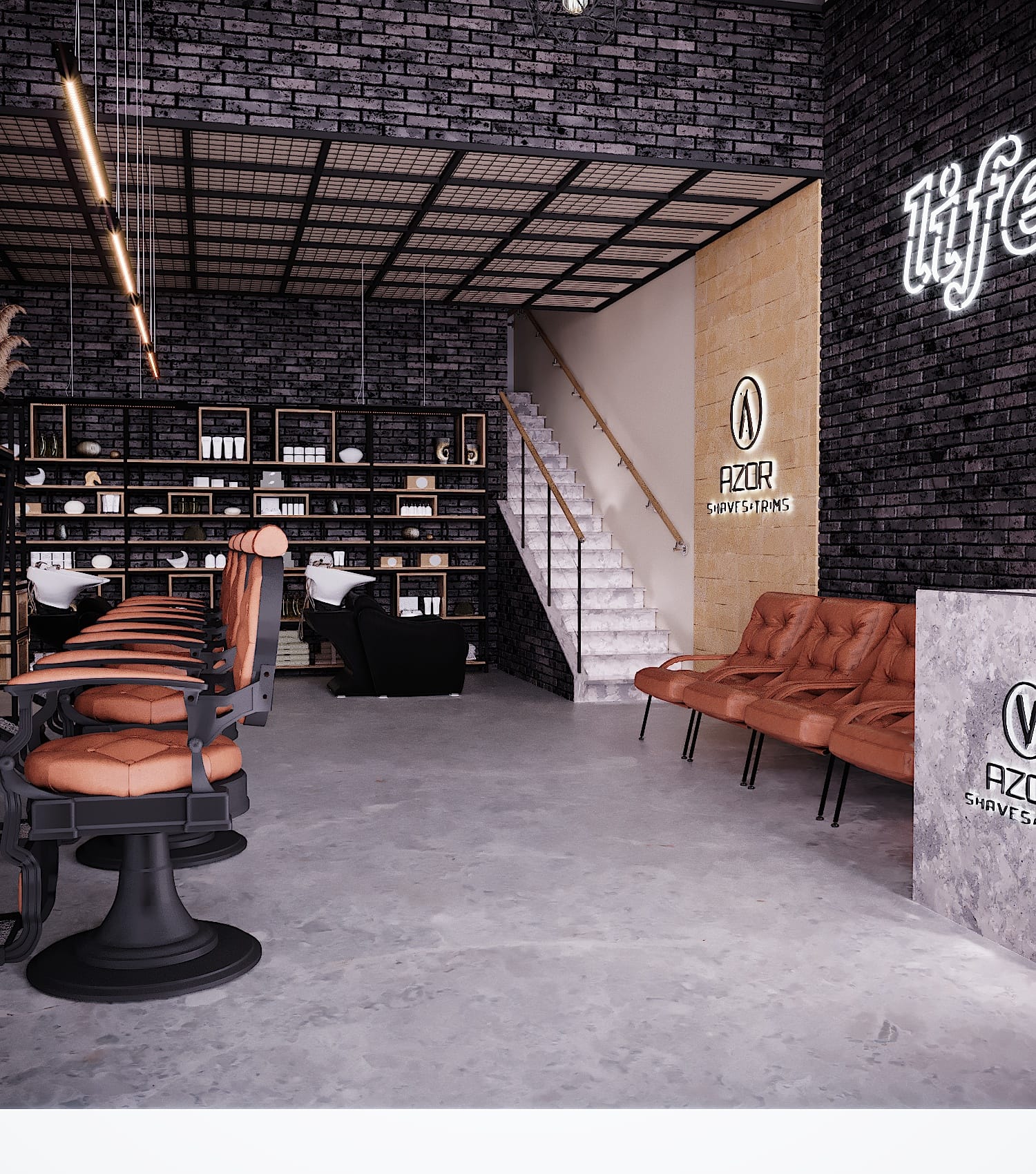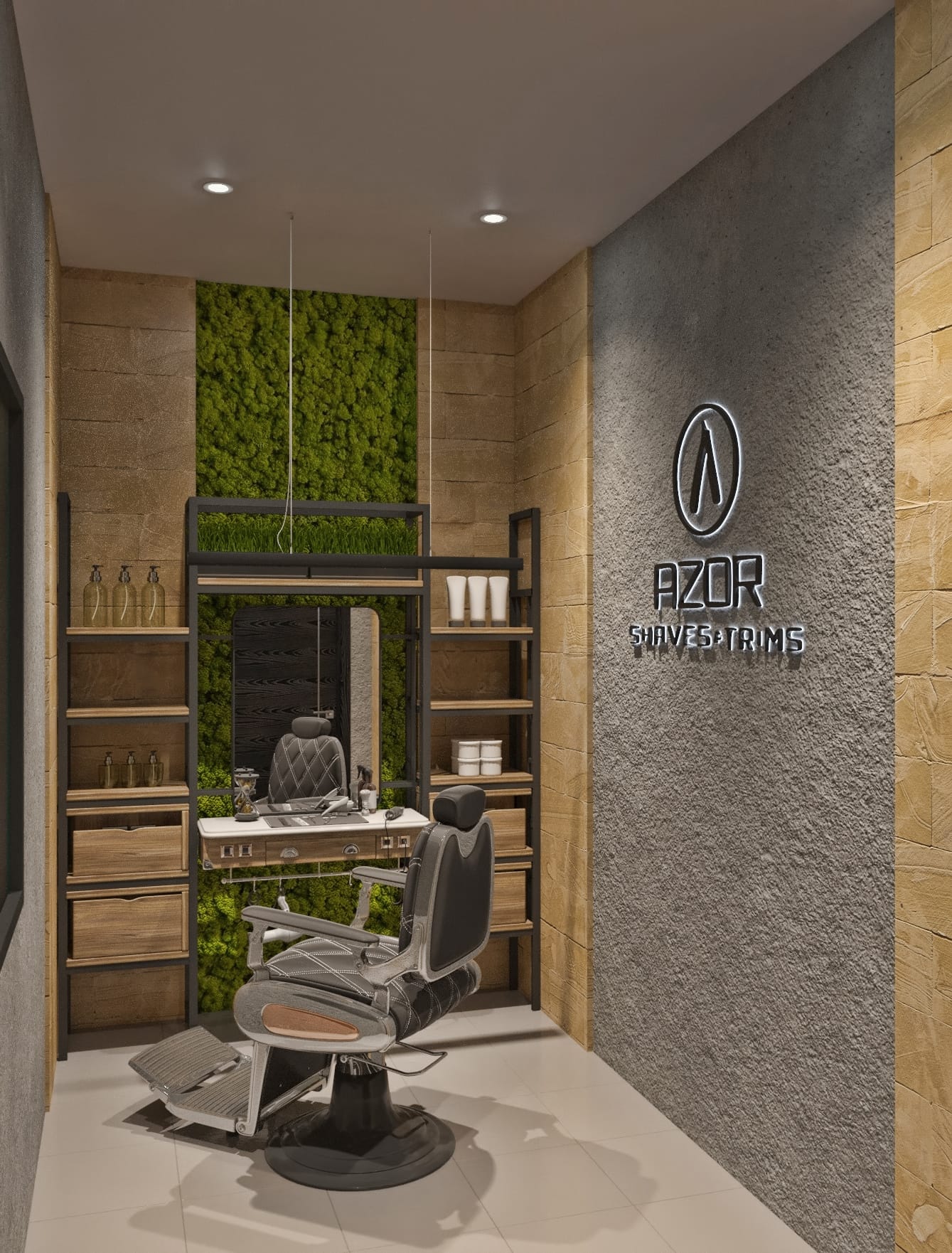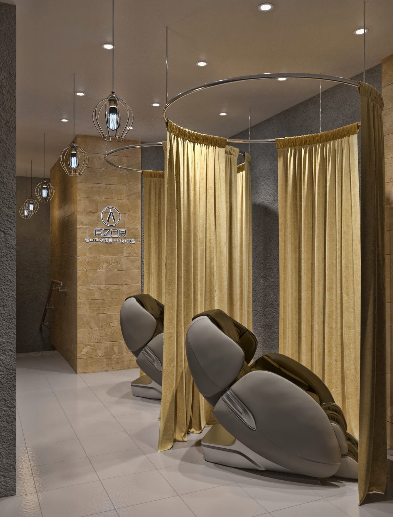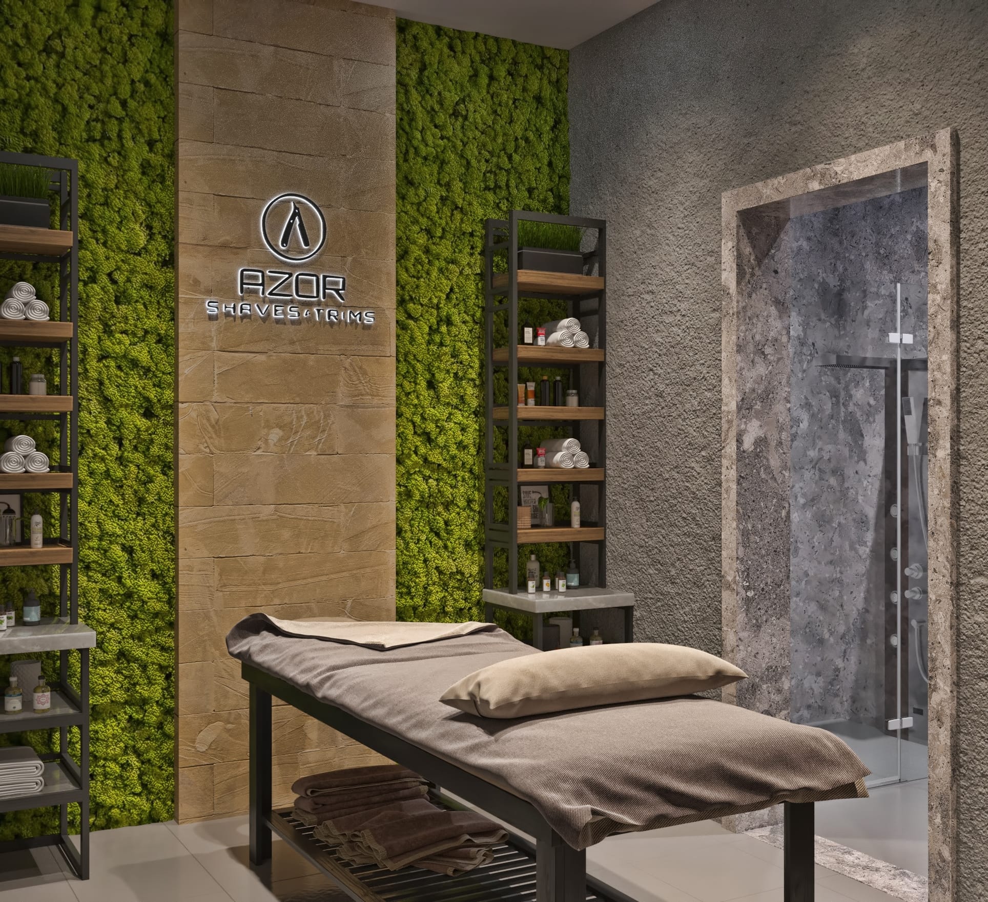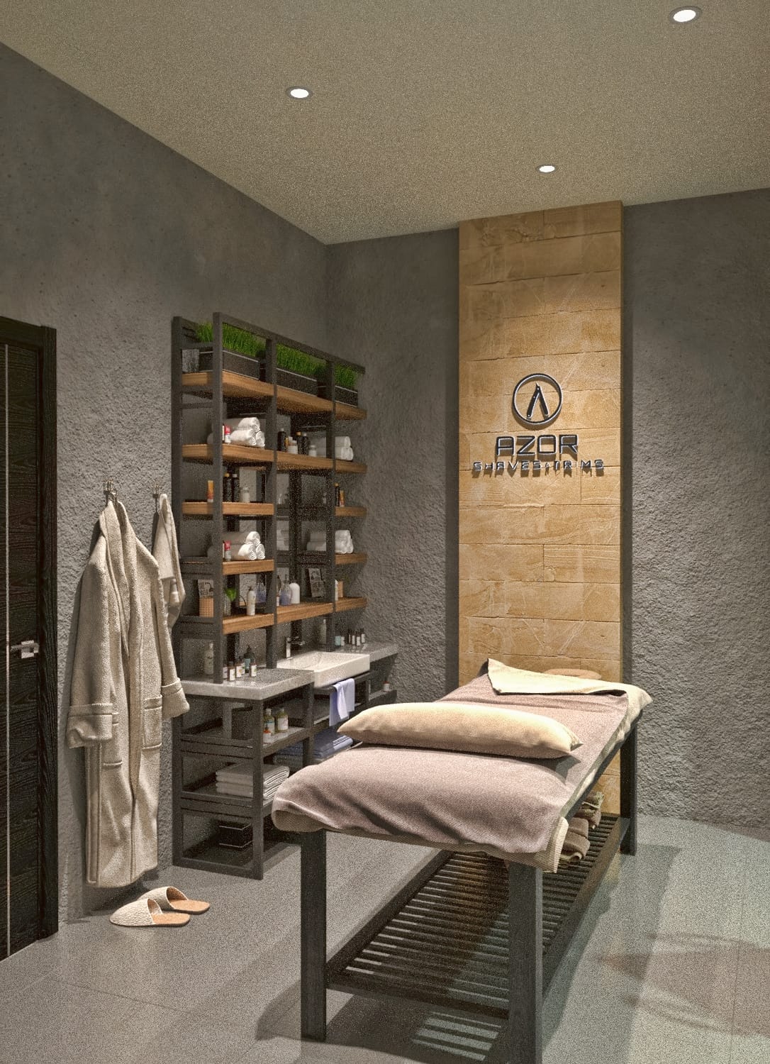 The spa area features minimalist yet opulent design elements, such as marble-framed glass partitions, textured stone walls, and softly lit treatment beds draped in warm-toned linens. A dedicated shower zone with sleek fixtures and a built-in bench ensures a seamless transition between treatments, while strategically placed lighting enhances the serene ambiance.The adjacent salon exudes industrial-chic charm, with exposed metal frameworks, wooden countertops, and ambient track lighting that highlights an array of grooming tools and organic products. Plush orange chairs and a central workstation with mirrored surfaces invite patrons to indulge in personalized beauty rituals. Every detail—from the AZOR branding etched into stone panels to the meticulous organization of towels and accessories—reflects a commitment to sophistication and guest comfort. This harmonious fusion of spa and salon creates a multifaceted retreat where luxury meets practicality, offering a transformative experience for the body and mind.