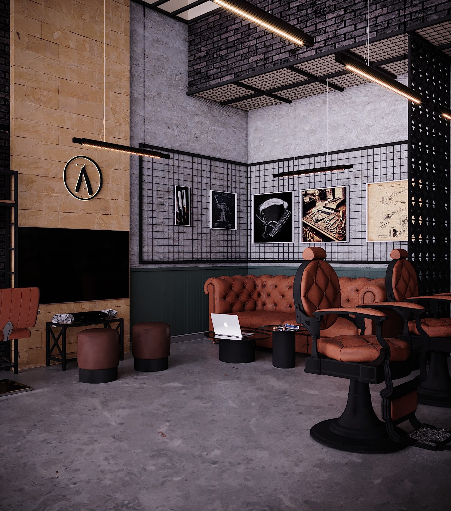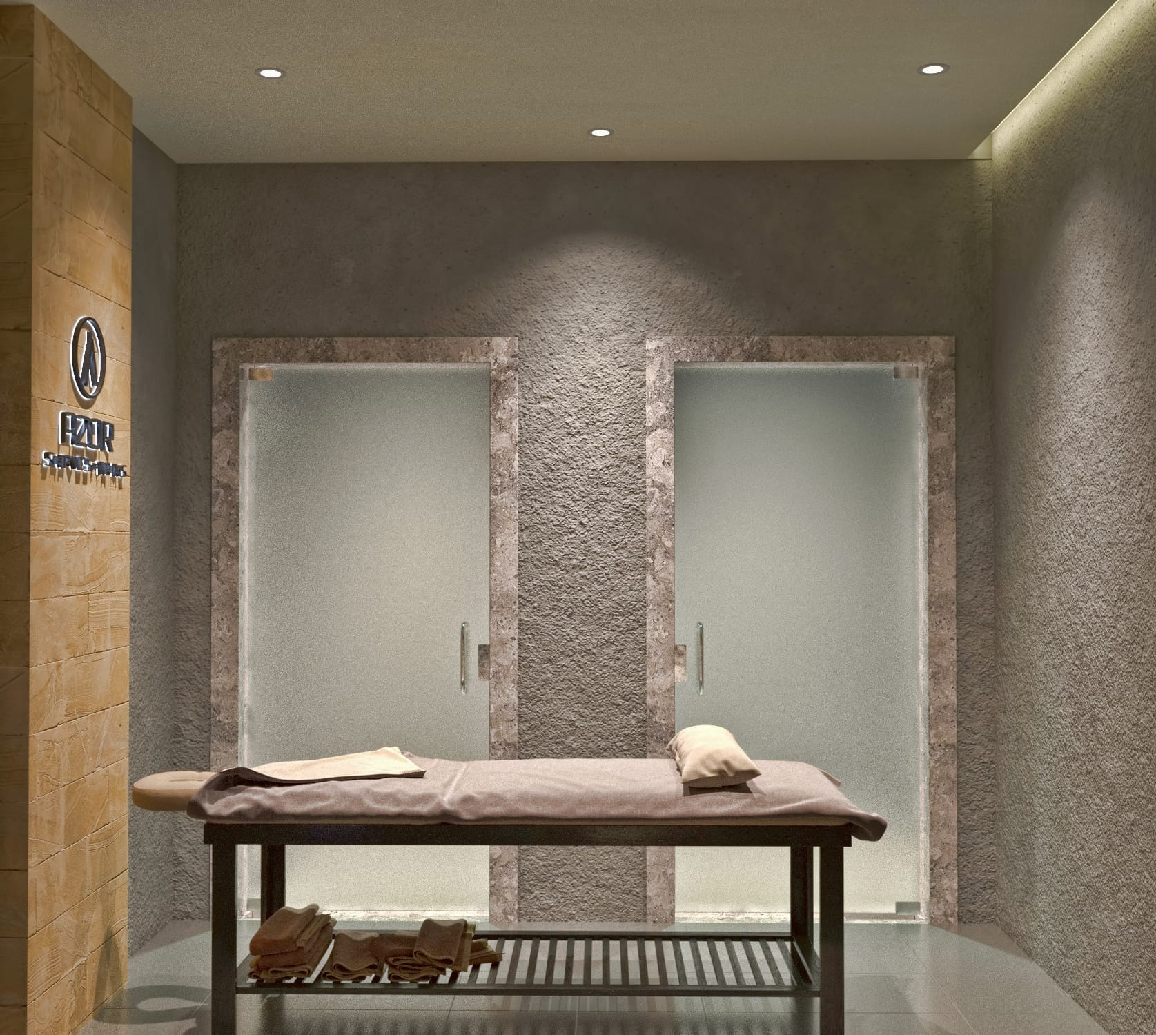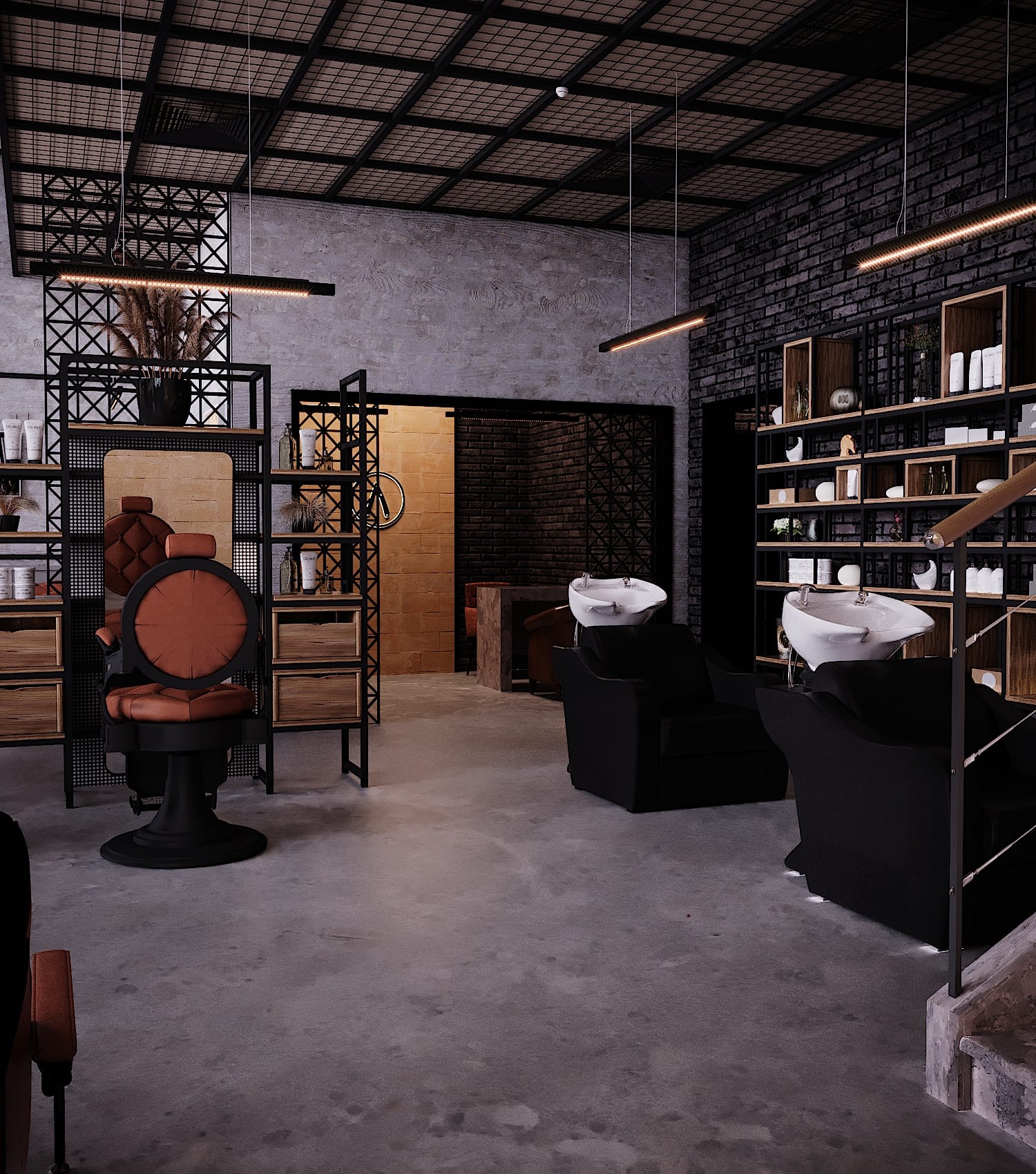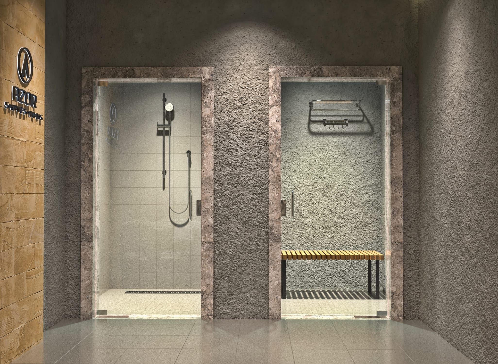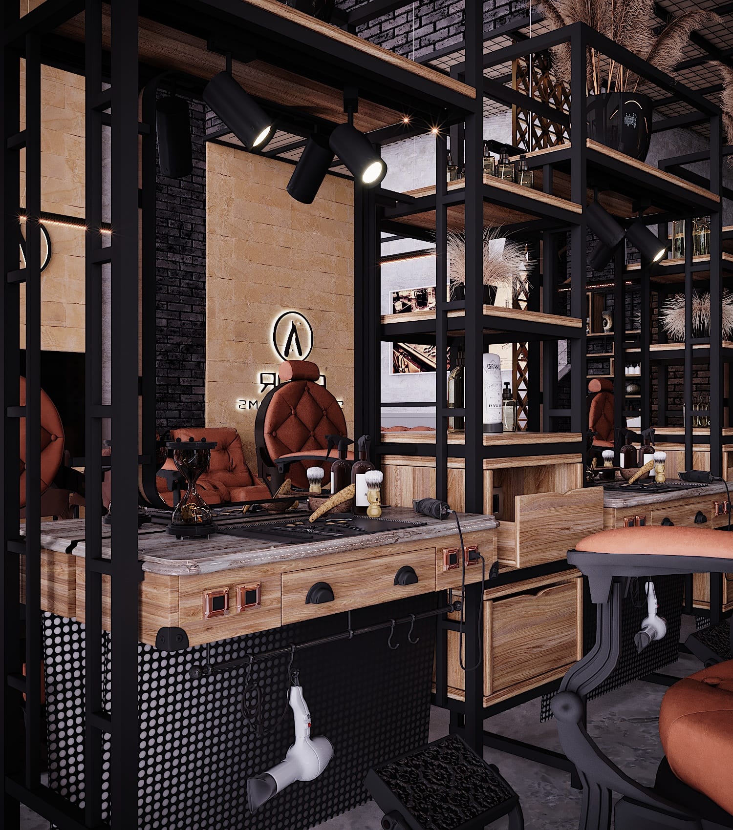 The spa area features minimalist yet opulent design elements, such as marble-framed glass partitions, textured stone walls, and softly lit treatment beds draped in warm-toned linens. A dedicated shower zone with sleek fixtures and a built-in bench ensures a seamless transition between treatments, while strategically placed lighting enhances the serene ambiance.The adjacent salon exudes industrial-chic charm, with exposed metal frameworks, wooden countertops, and ambient track lighting that highlights an array of grooming tools and organic products. Plush orange chairs and a central workstation with mirrored surfaces invite patrons to indulge in personalized beauty rituals. Every detail—from the AZOR branding etched into stone panels to the meticulous organization of towels and accessories—reflects a commitment to sophistication and guest comfort. This harmonious fusion of spa and salon creates a multifaceted retreat where luxury meets practicality, offering a transformative experience for the body and mind.