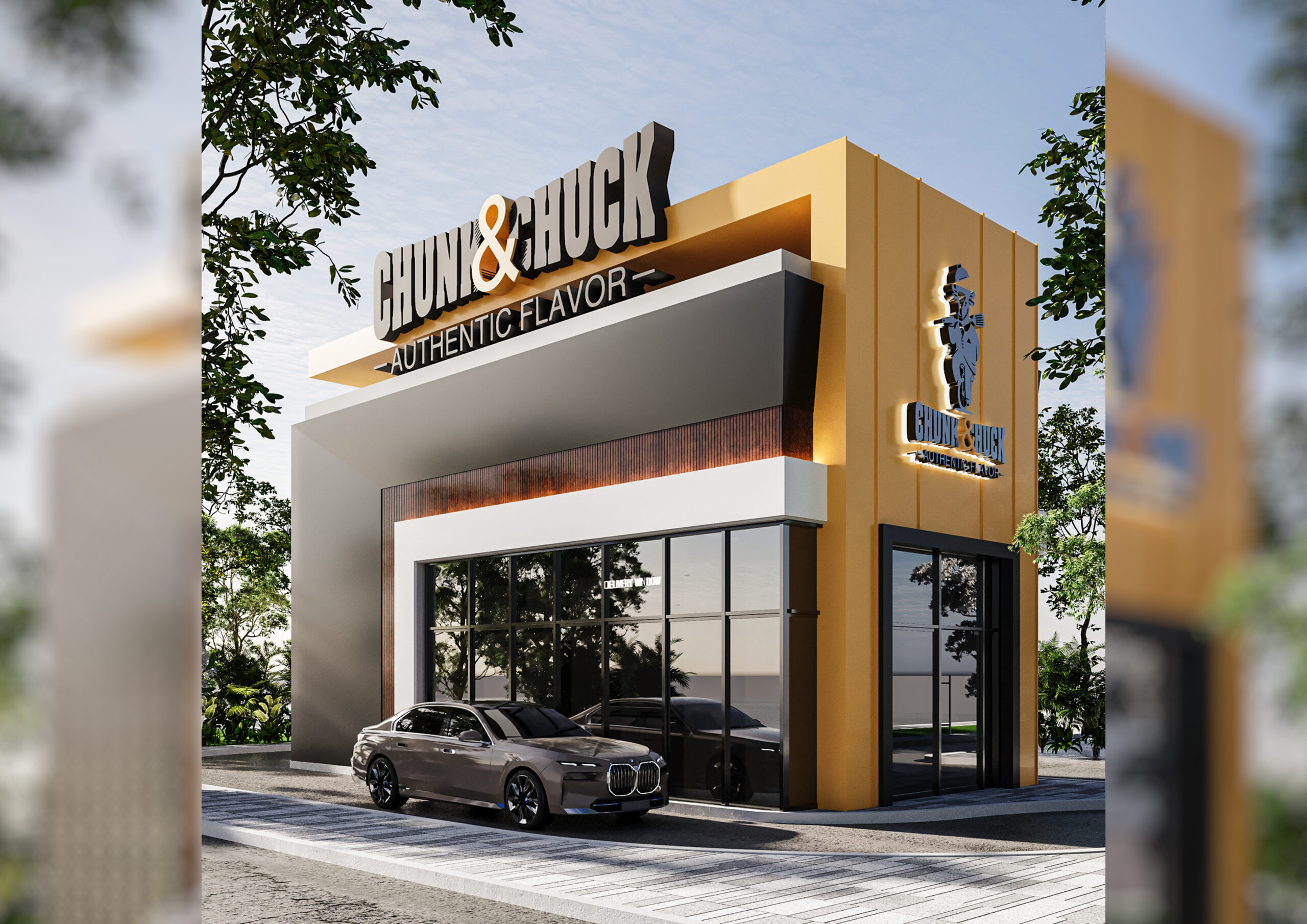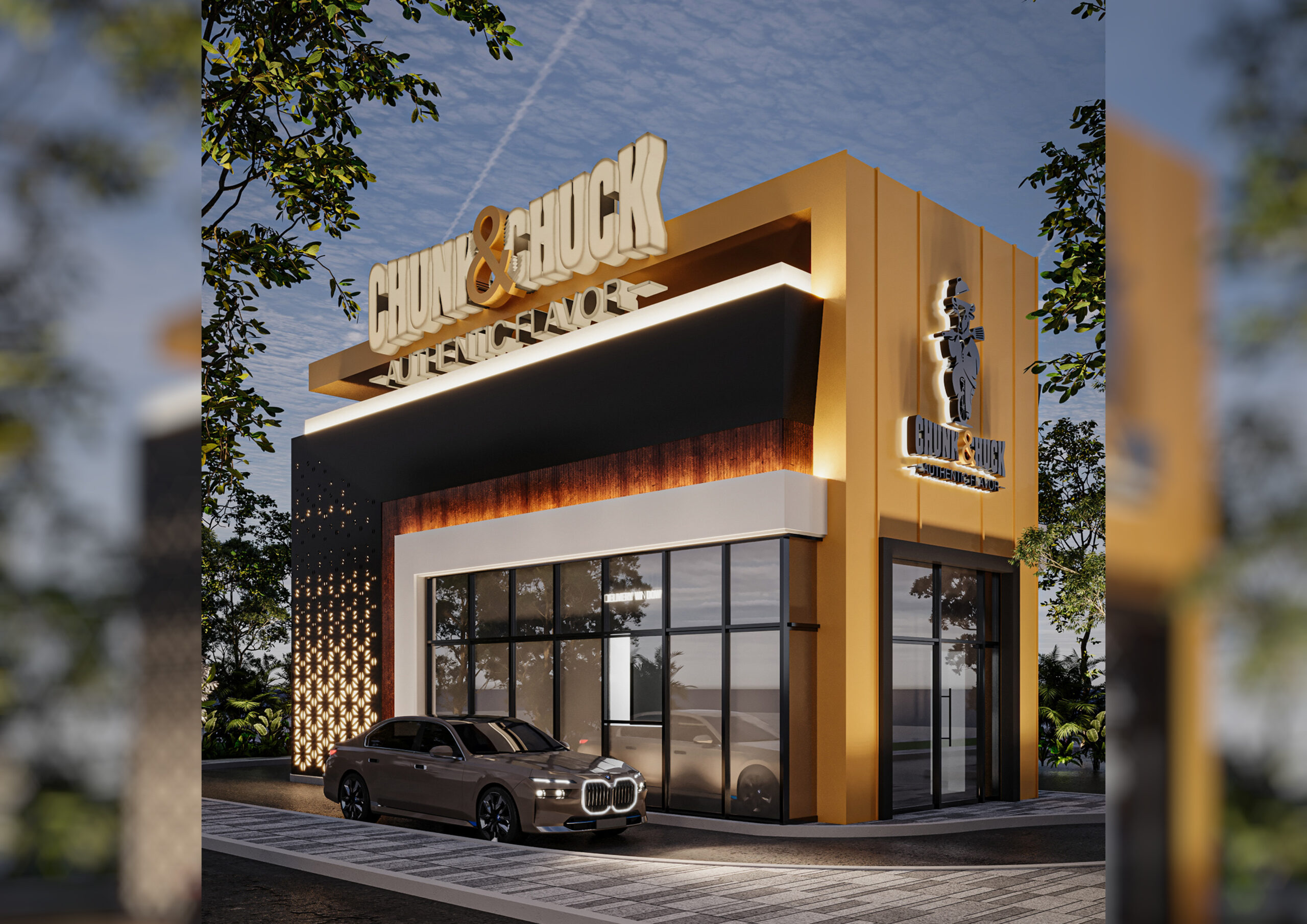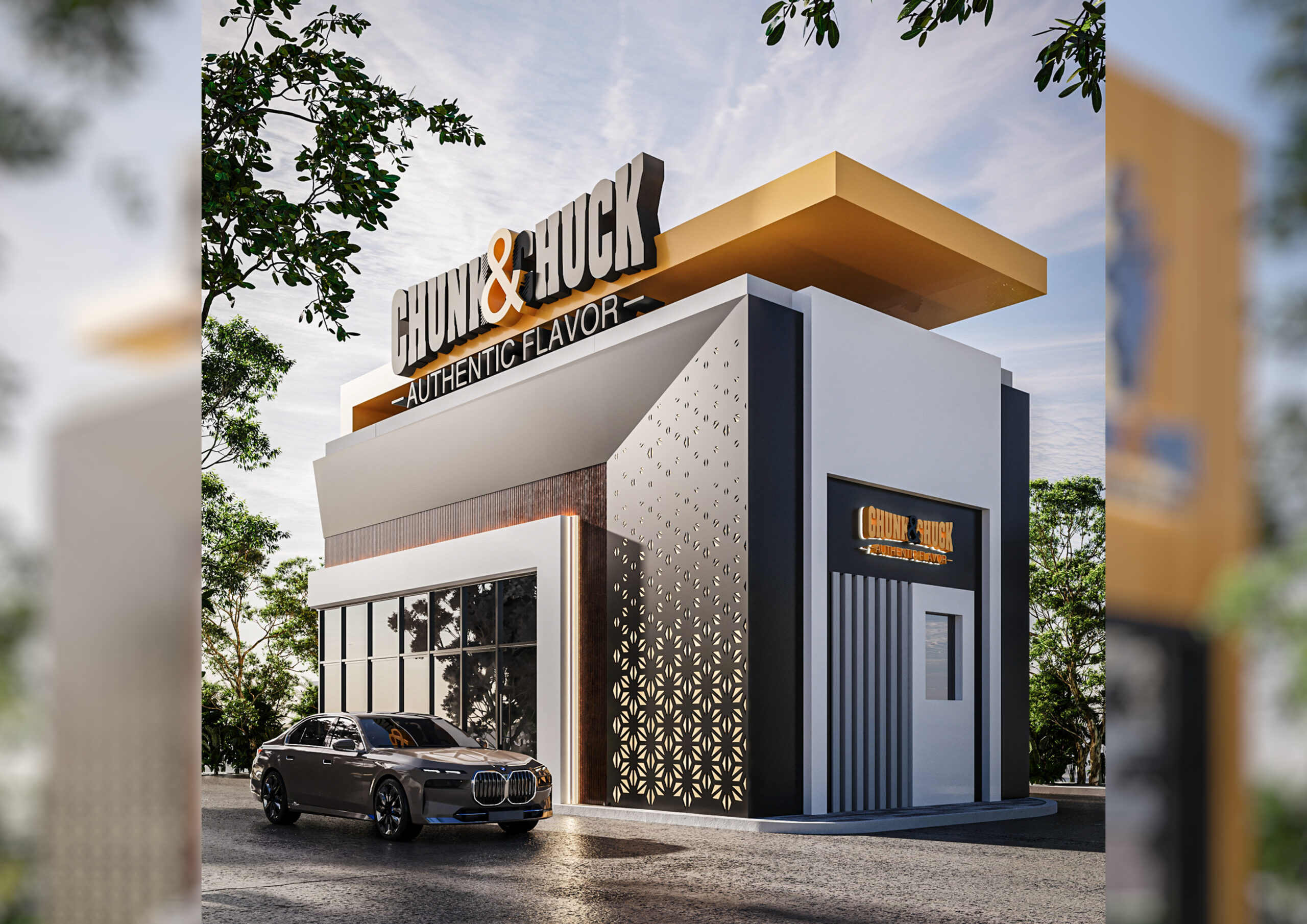 The design of Drive Thru to serve cars, beverages, and street cuisine in Modern style and explicit black and yellow colors give a modern and attractive touch to the surrounding environment.