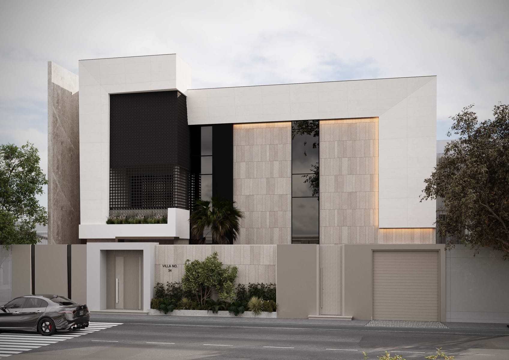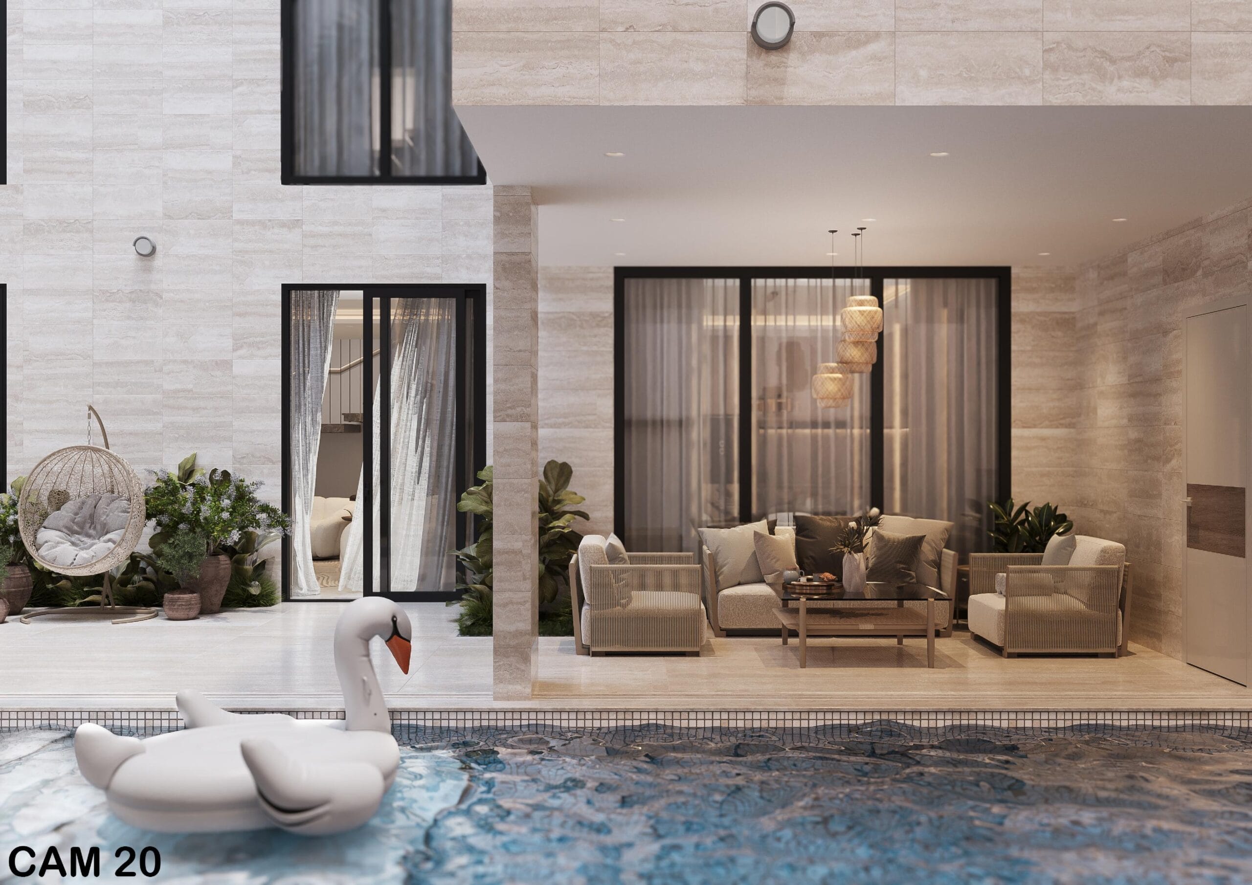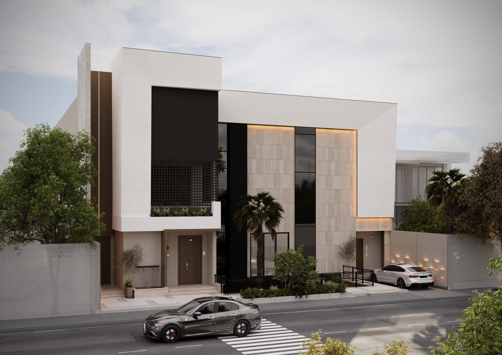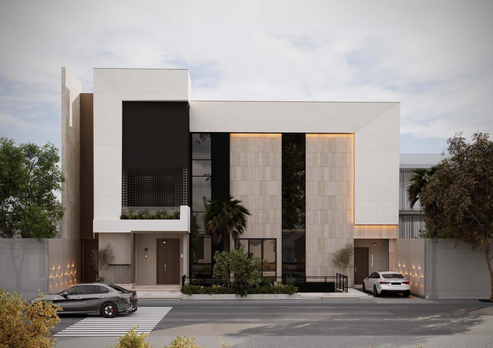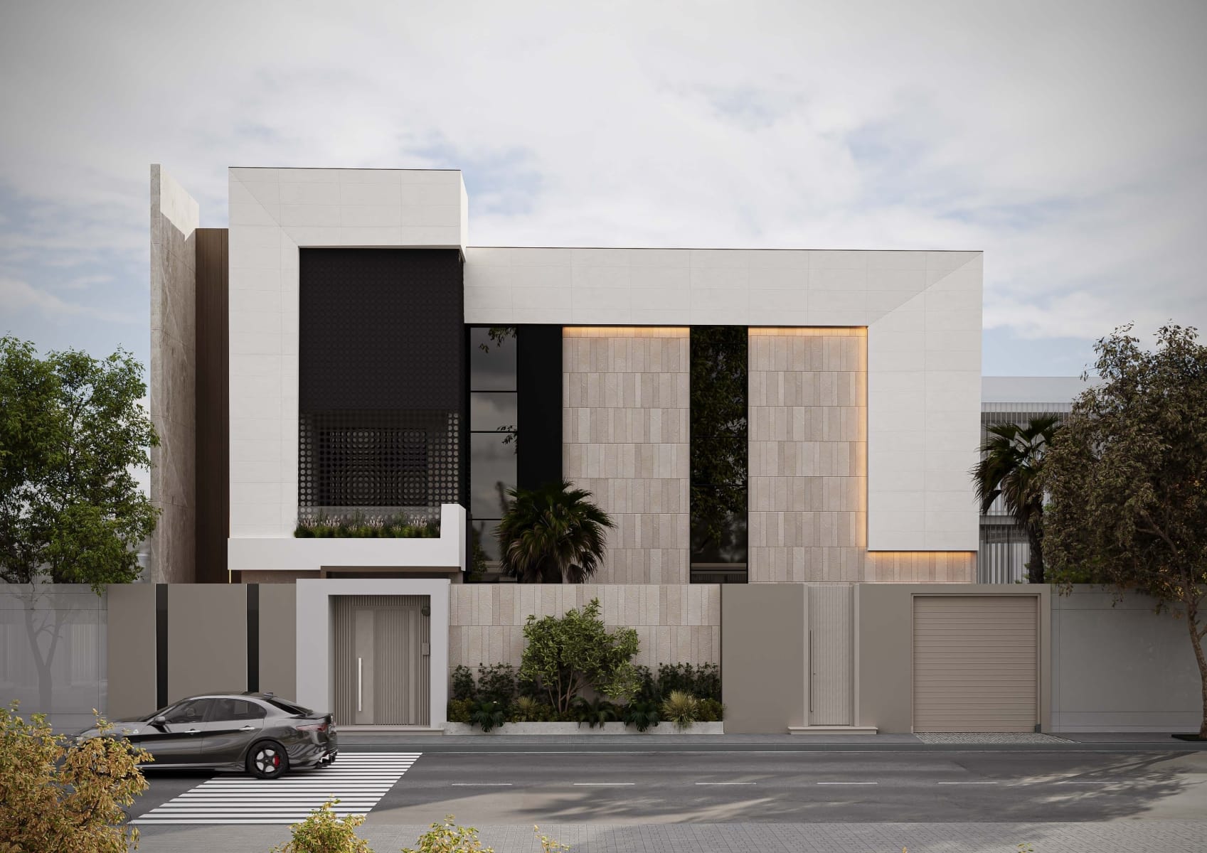 The H Villa exemplifies contemporary elegance, blending minimalist architecture with warm, inviting interiors. Its sleek exterior features clean lines, large glass windows, and a neutral color palette accented by black metal details.