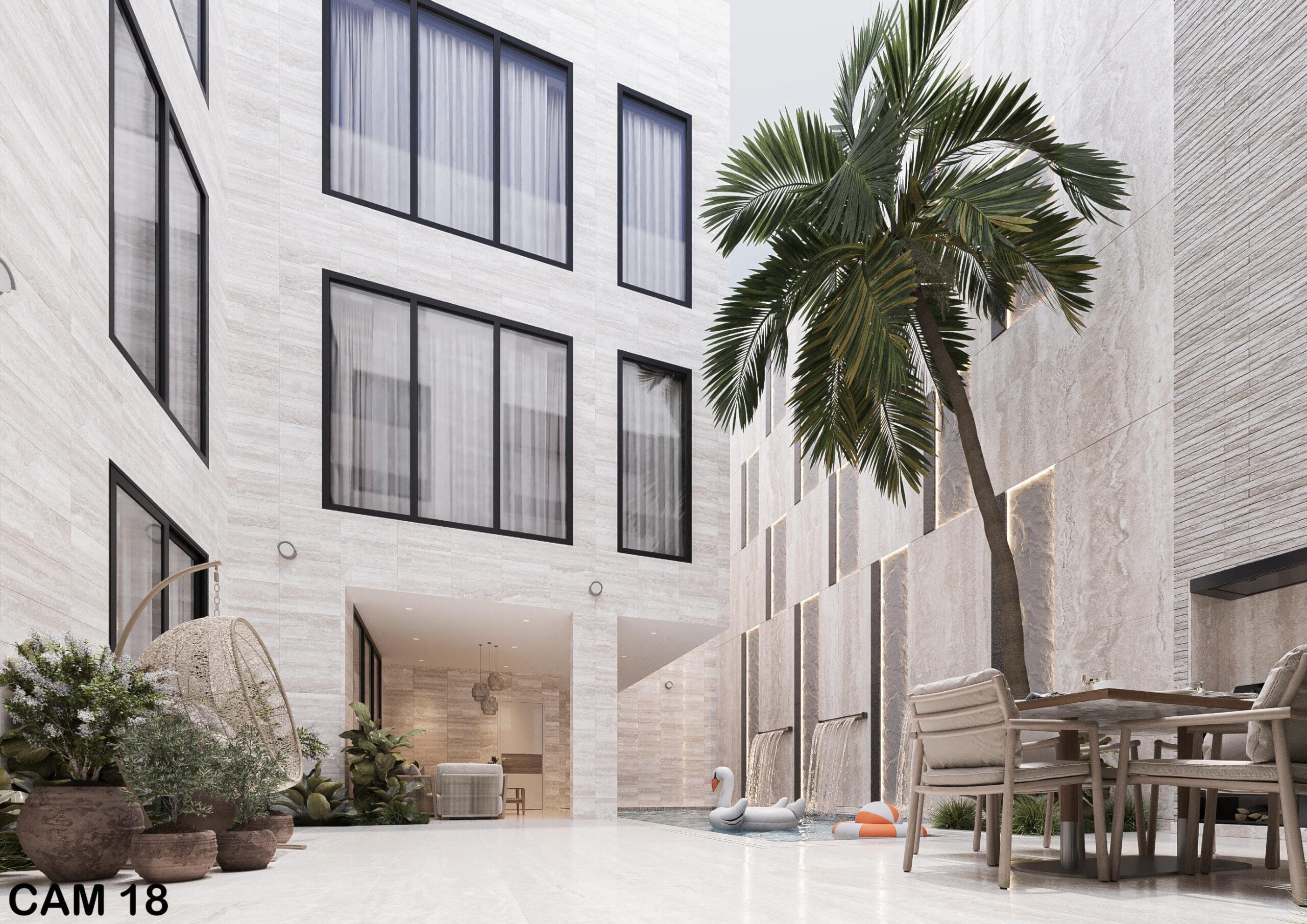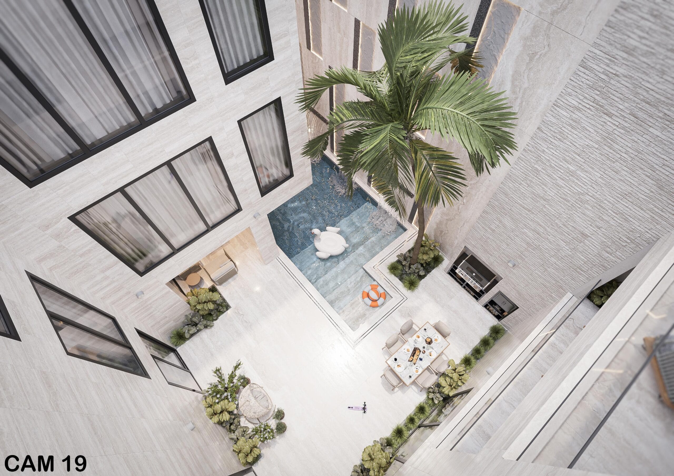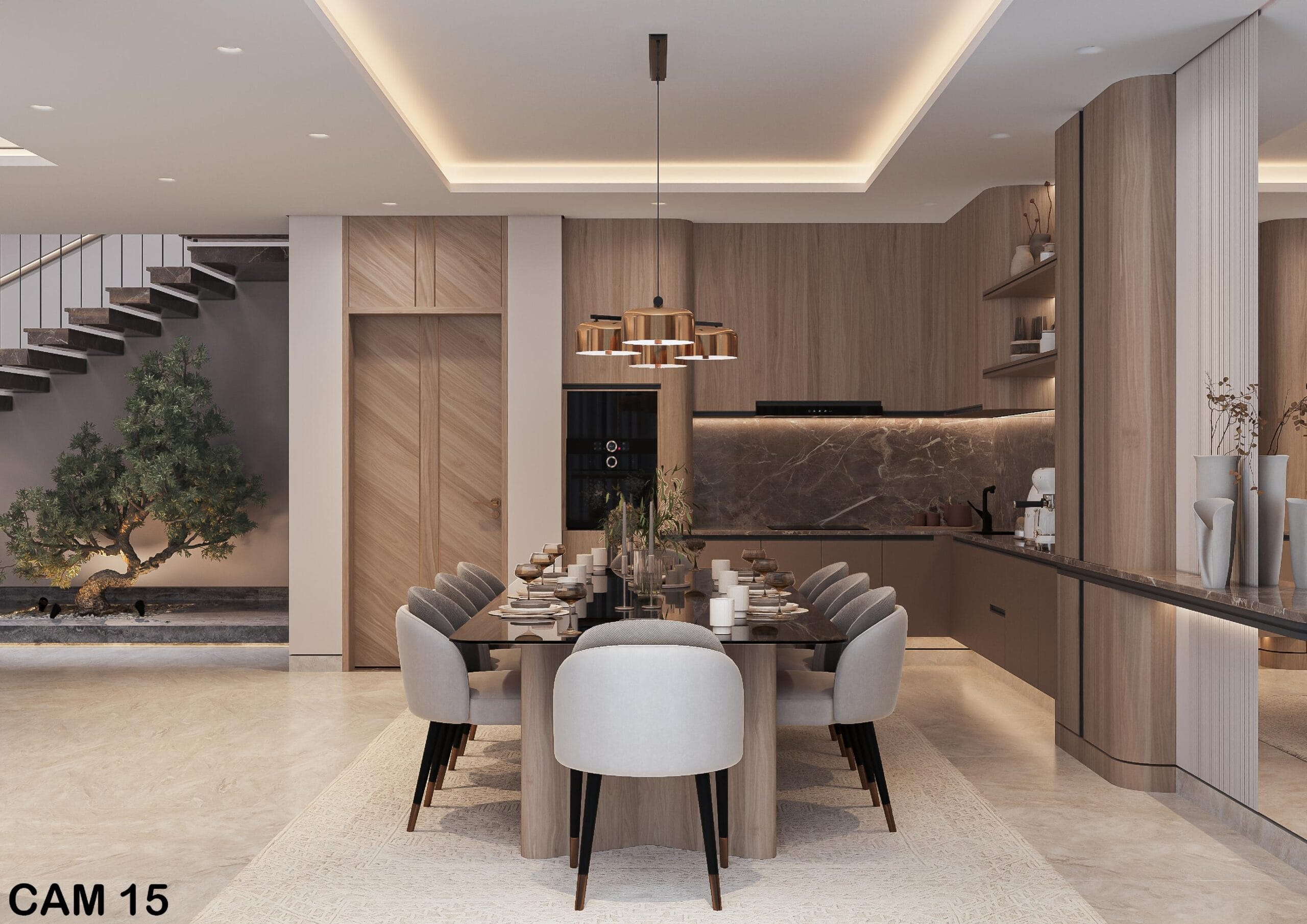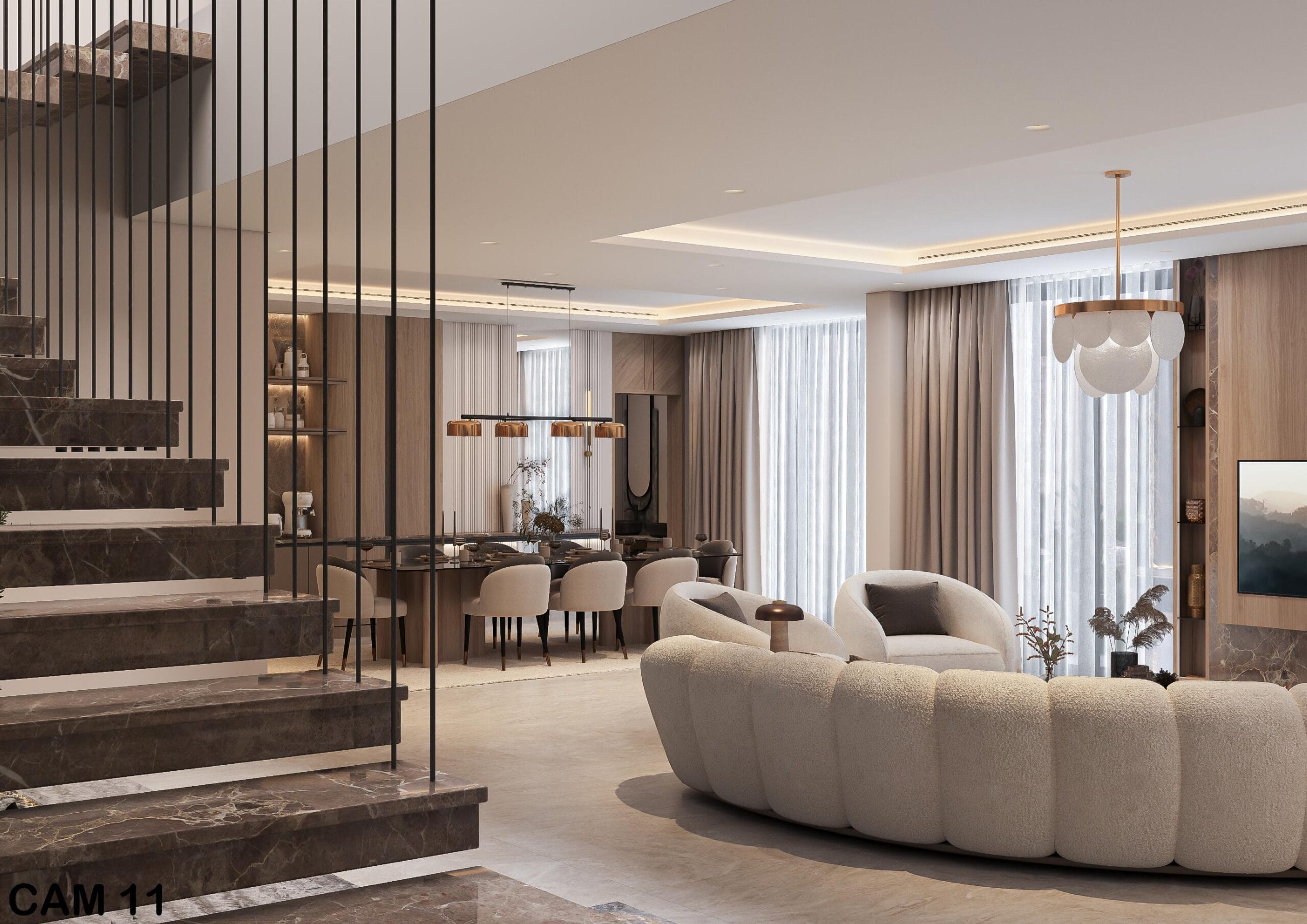 The H Villa exemplifies contemporary elegance, blending minimalist architecture with warm, inviting interiors. Its sleek exterior features clean lines, large glass windows, and a neutral color palette accented by black metal details.