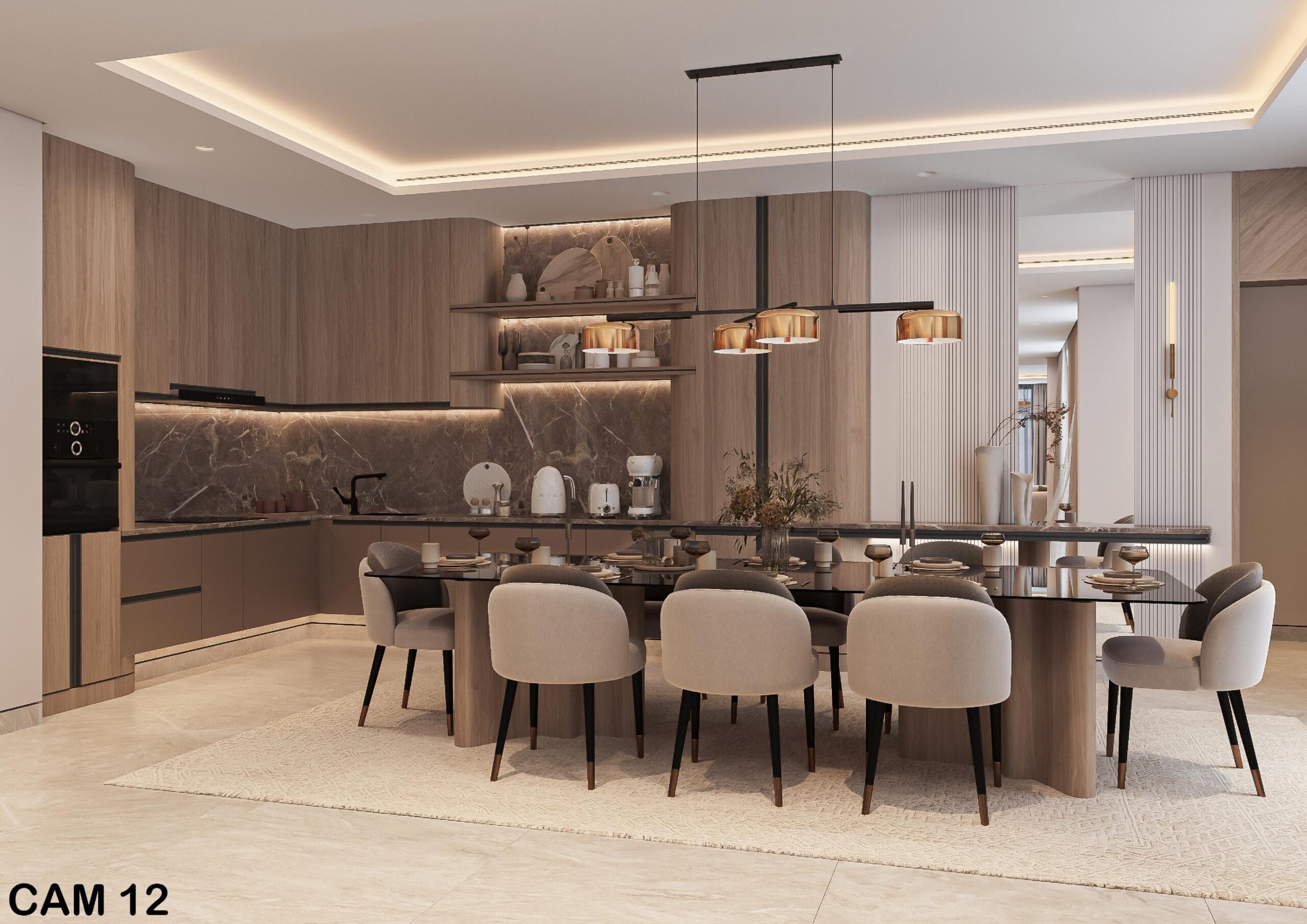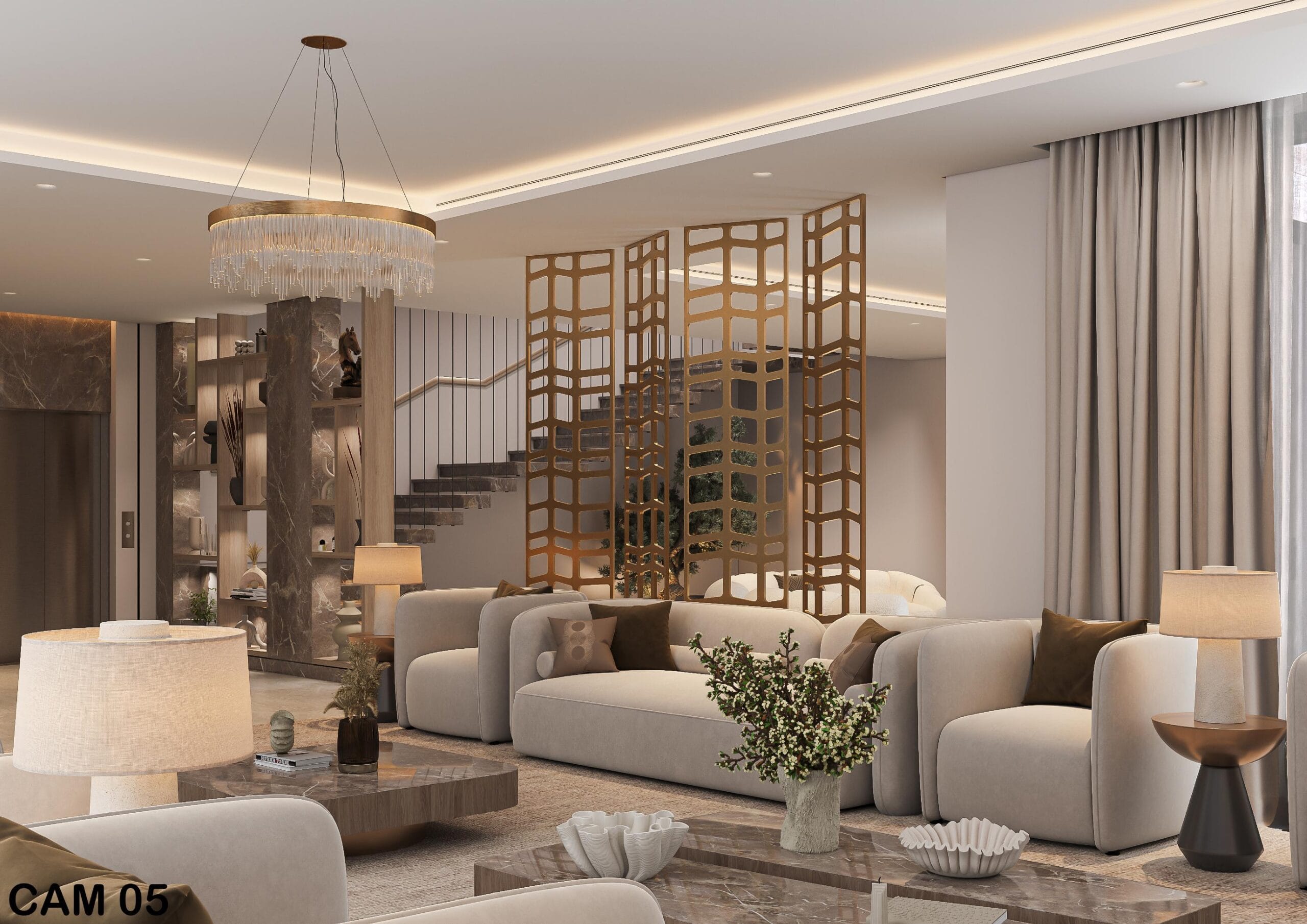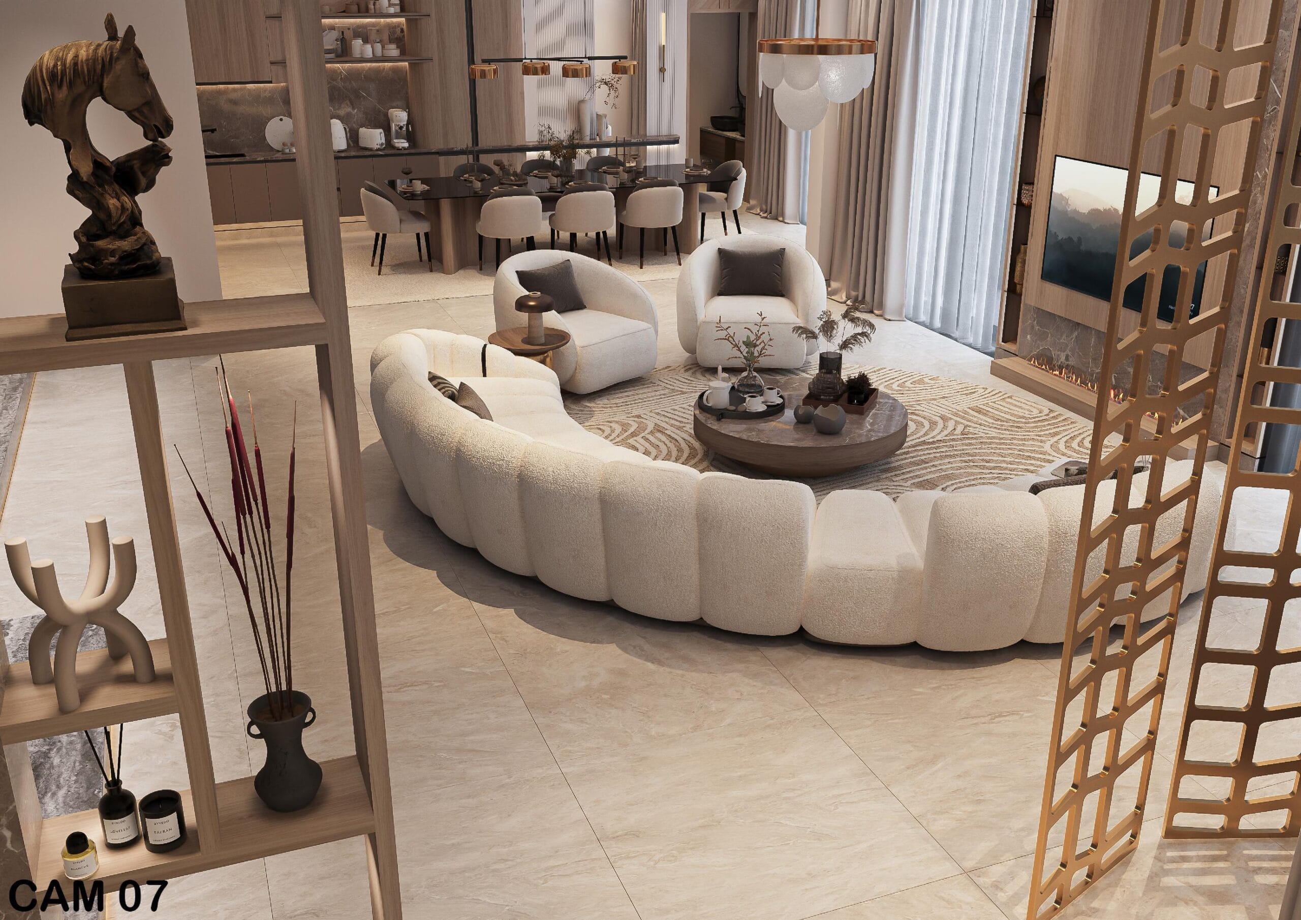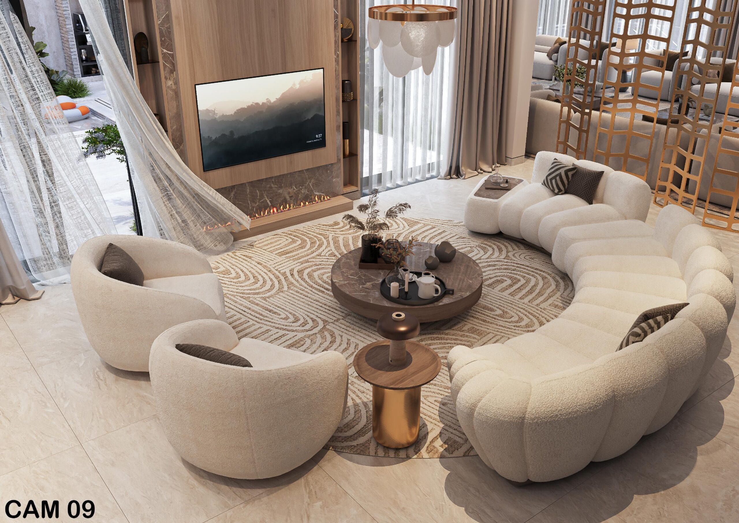 Creating a striking yet understated presence. Inside, the open-concept living space boasts plush white furnishings, intricate golden decor, and a fireplace that adds a cozy touch to the grand, airy room. The gourmet kitchen and dining area are adorned with polished wood finishes, marble countertops, and ambient lighting, perfect for hosting lavish gatherings. Outdoor living extends seamlessly with a private terrace, lush landscaping, and a tranquil poolside area, offering a seamless fusion of luxury and nature.