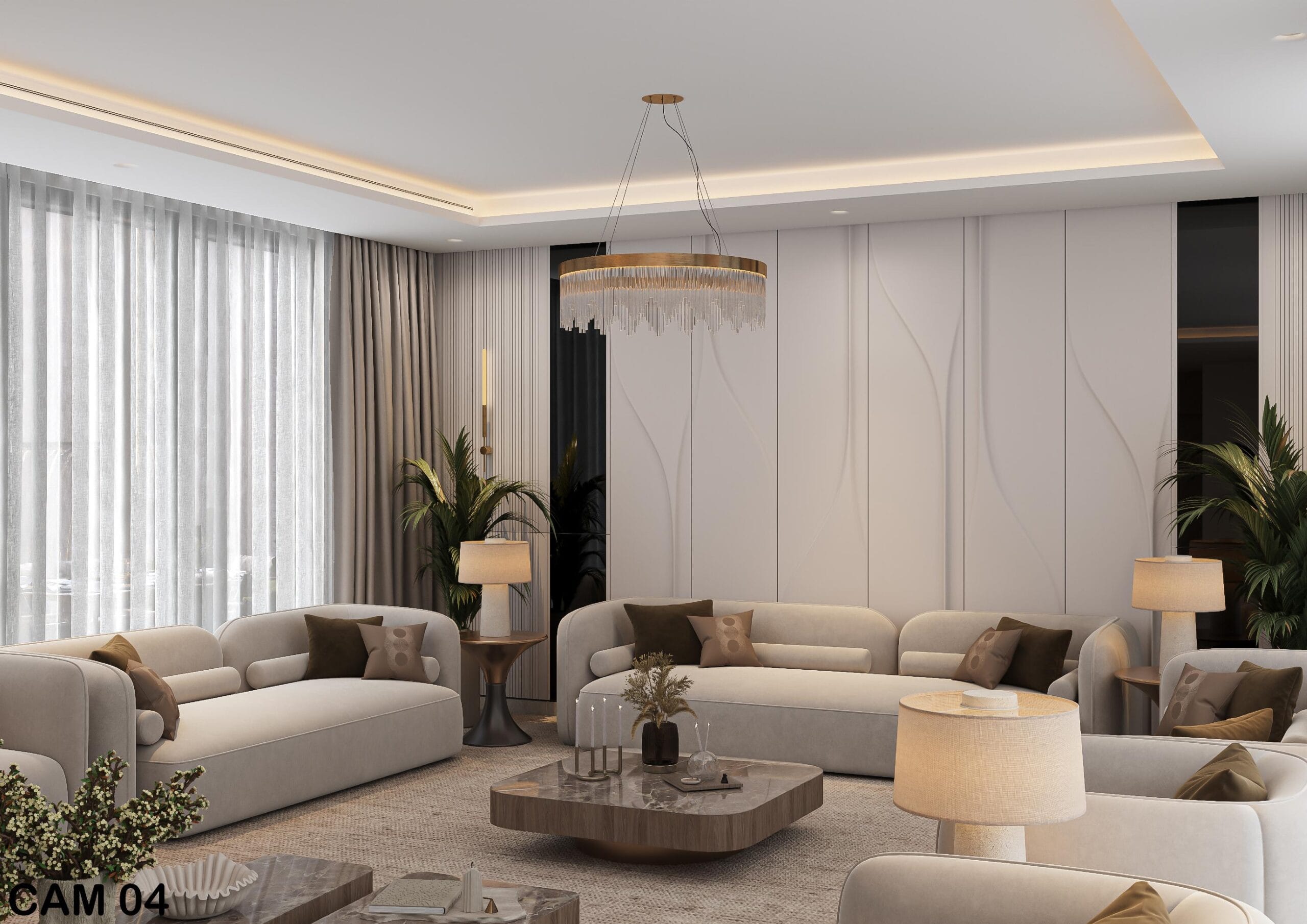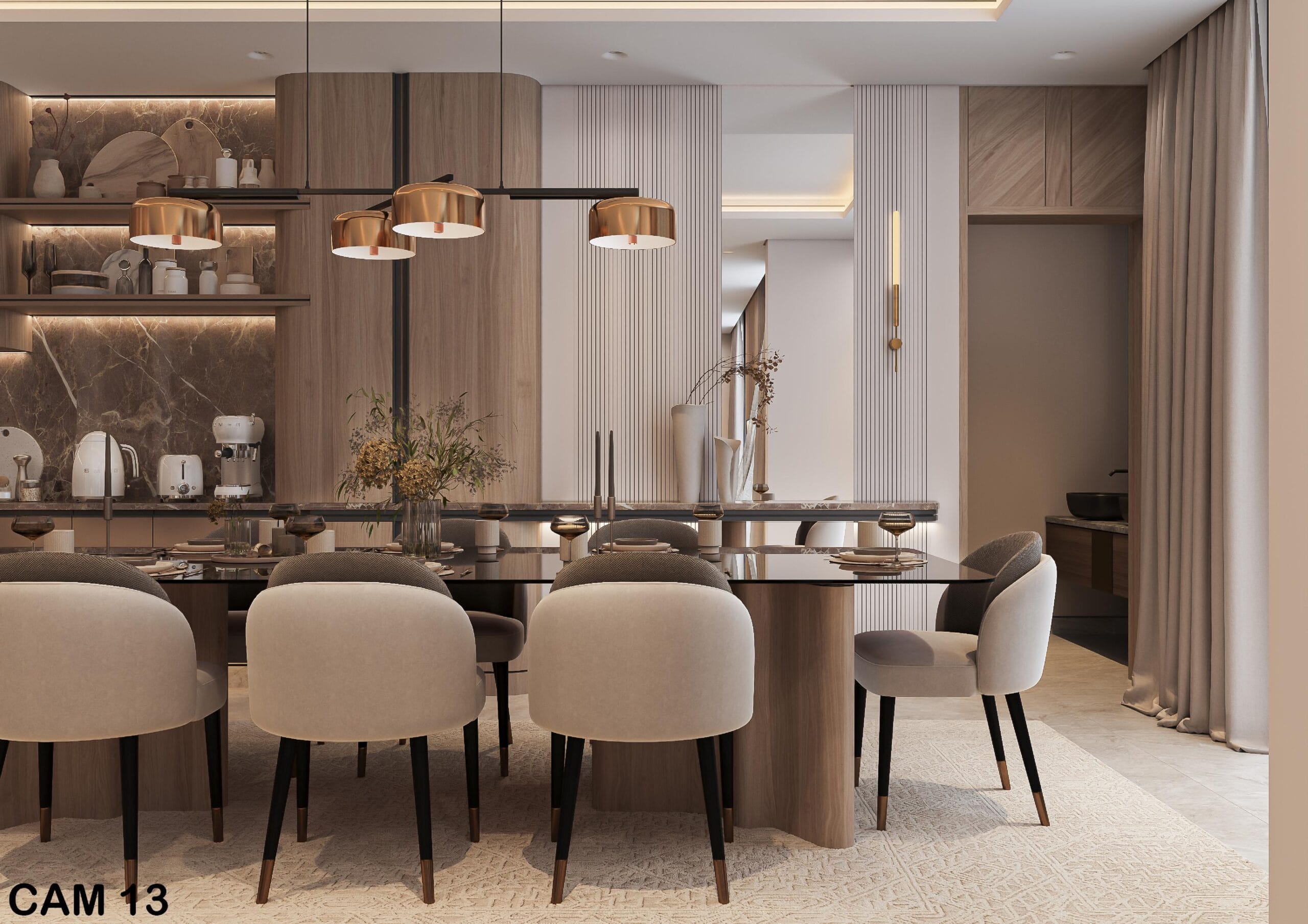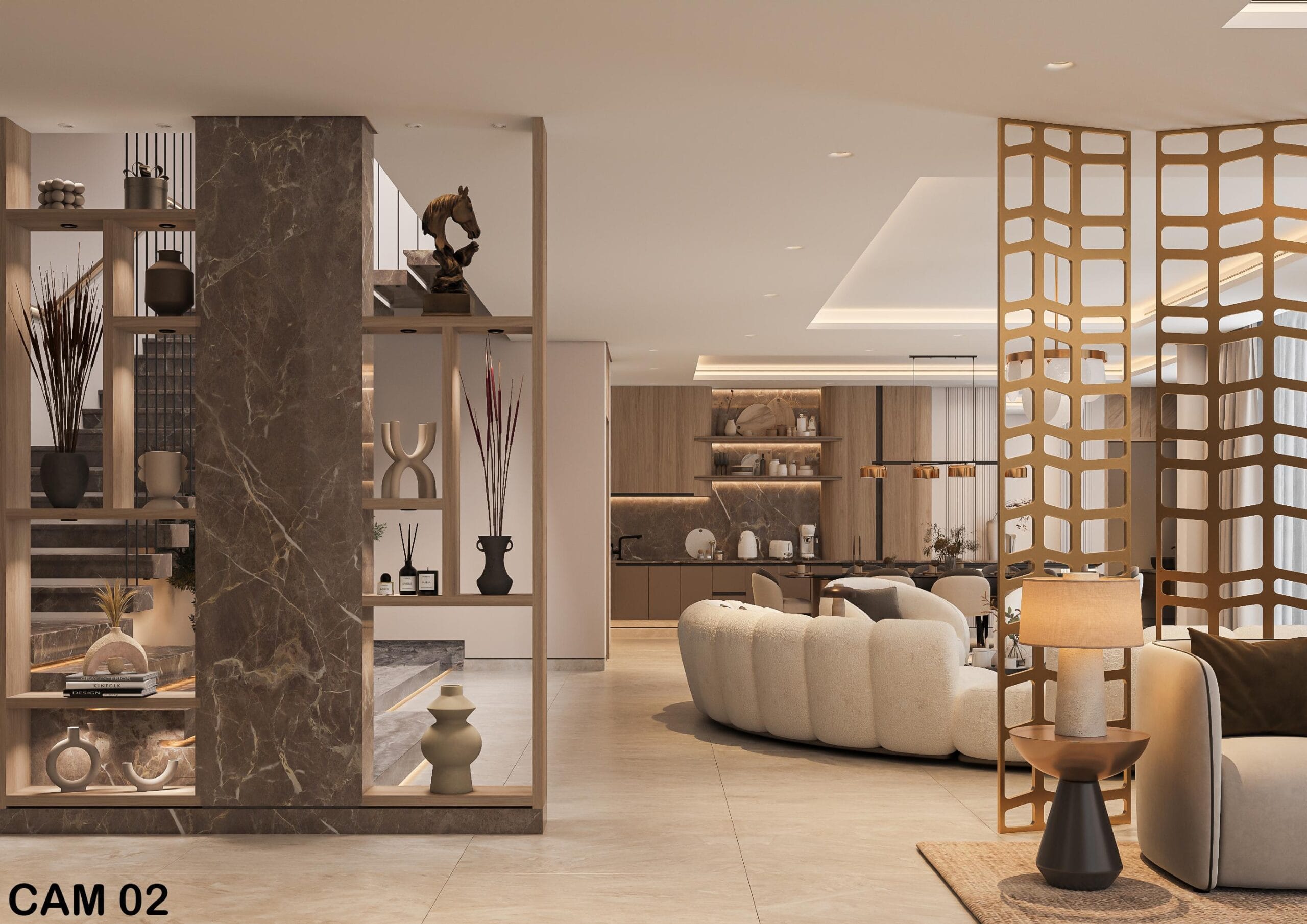 Creating a striking yet understated presence. Inside, the open-concept living space boasts plush white furnishings, intricate golden decor, and a fireplace that adds a cozy touch to the grand, airy room. The gourmet kitchen and dining area are adorned with polished wood finishes, marble countertops, and ambient lighting, perfect for hosting lavish gatherings. Outdoor living extends seamlessly with a private terrace, lush landscaping, and a tranquil poolside area, offering a seamless fusion of luxury and nature.