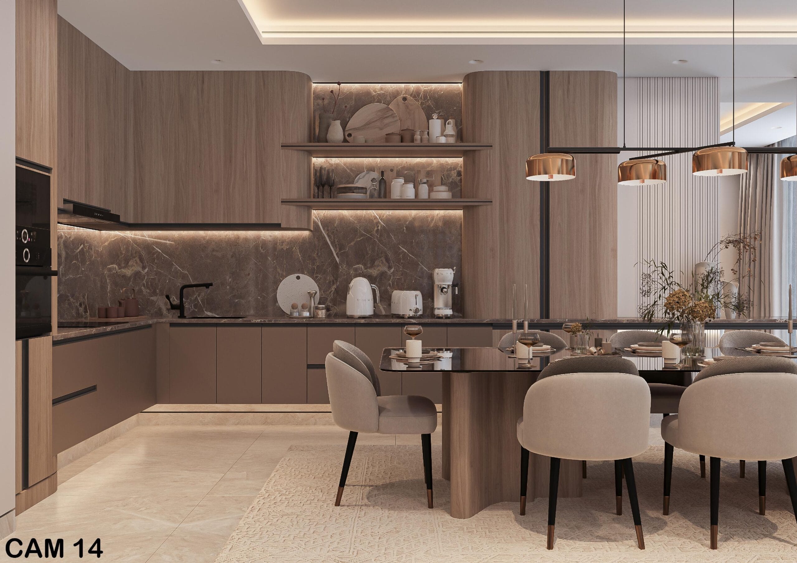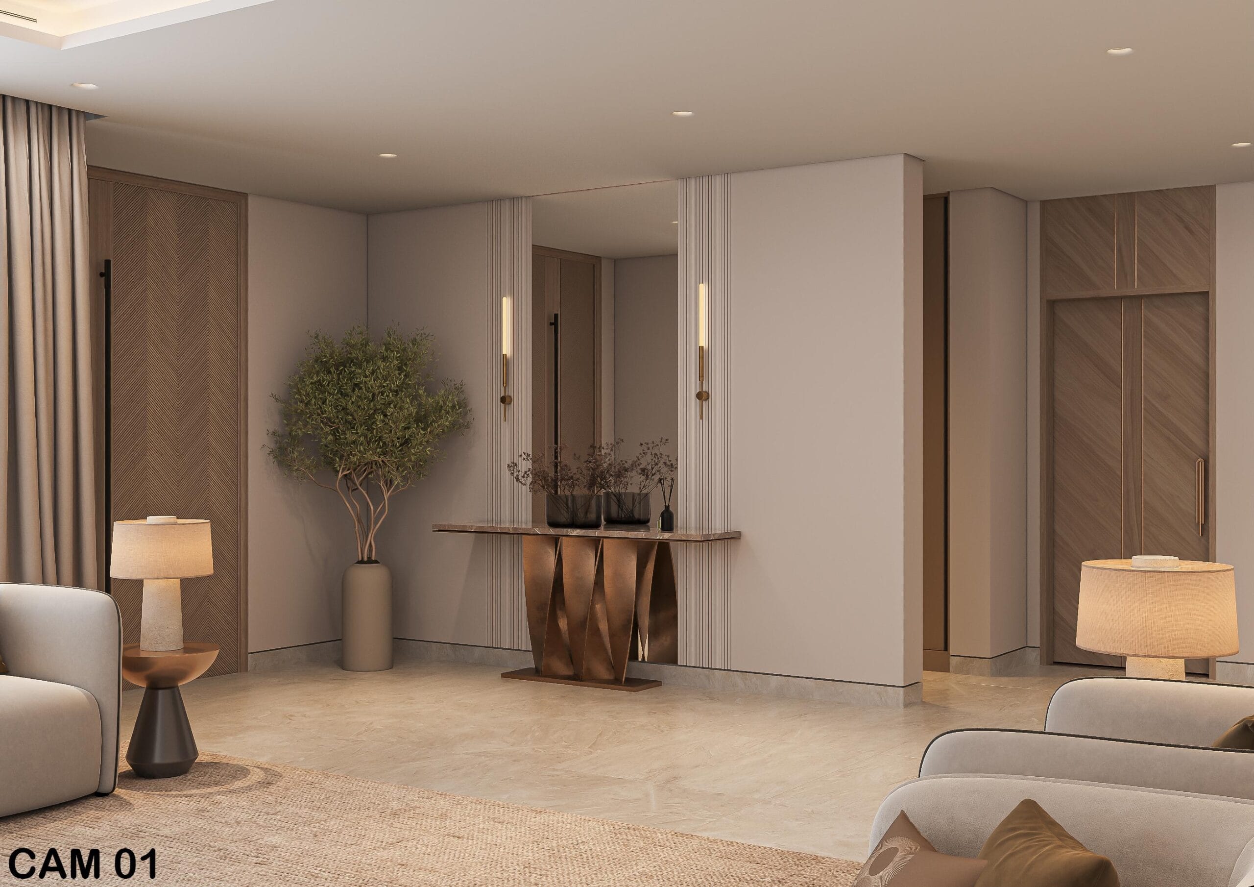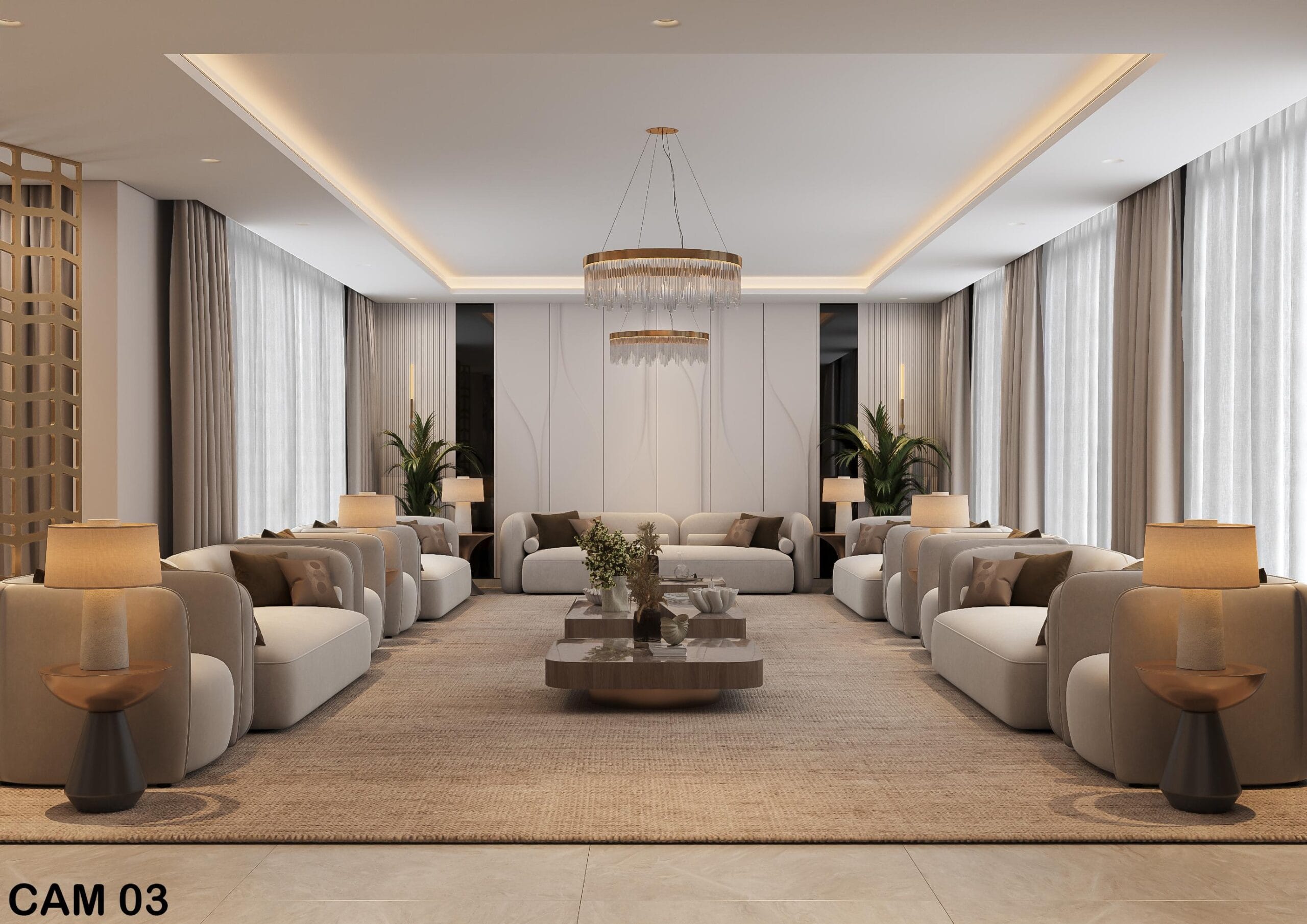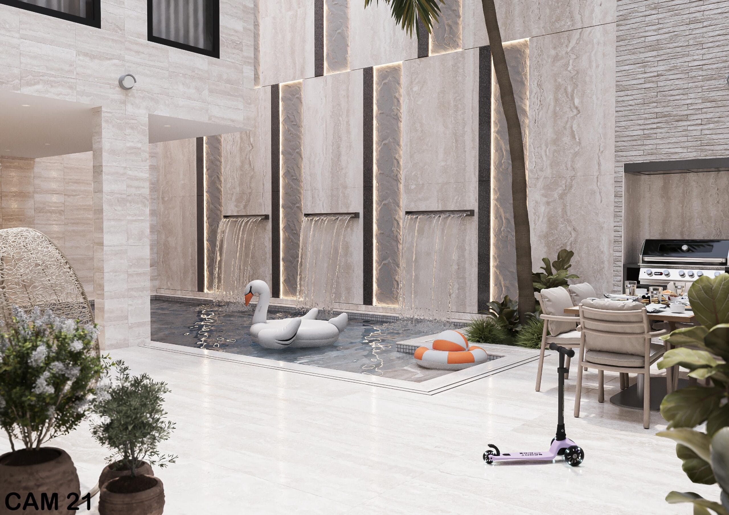 Creating a striking yet understated presence. Inside, the open-concept living space boasts plush white furnishings, intricate golden decor, and a fireplace that adds a cozy touch to the grand, airy room. The gourmet kitchen and dining area are adorned with polished wood finishes, marble countertops, and ambient lighting, perfect for hosting lavish gatherings. Outdoor living extends seamlessly with a private terrace, lush landscaping, and a tranquil poolside area, offering a seamless fusion of luxury and nature.