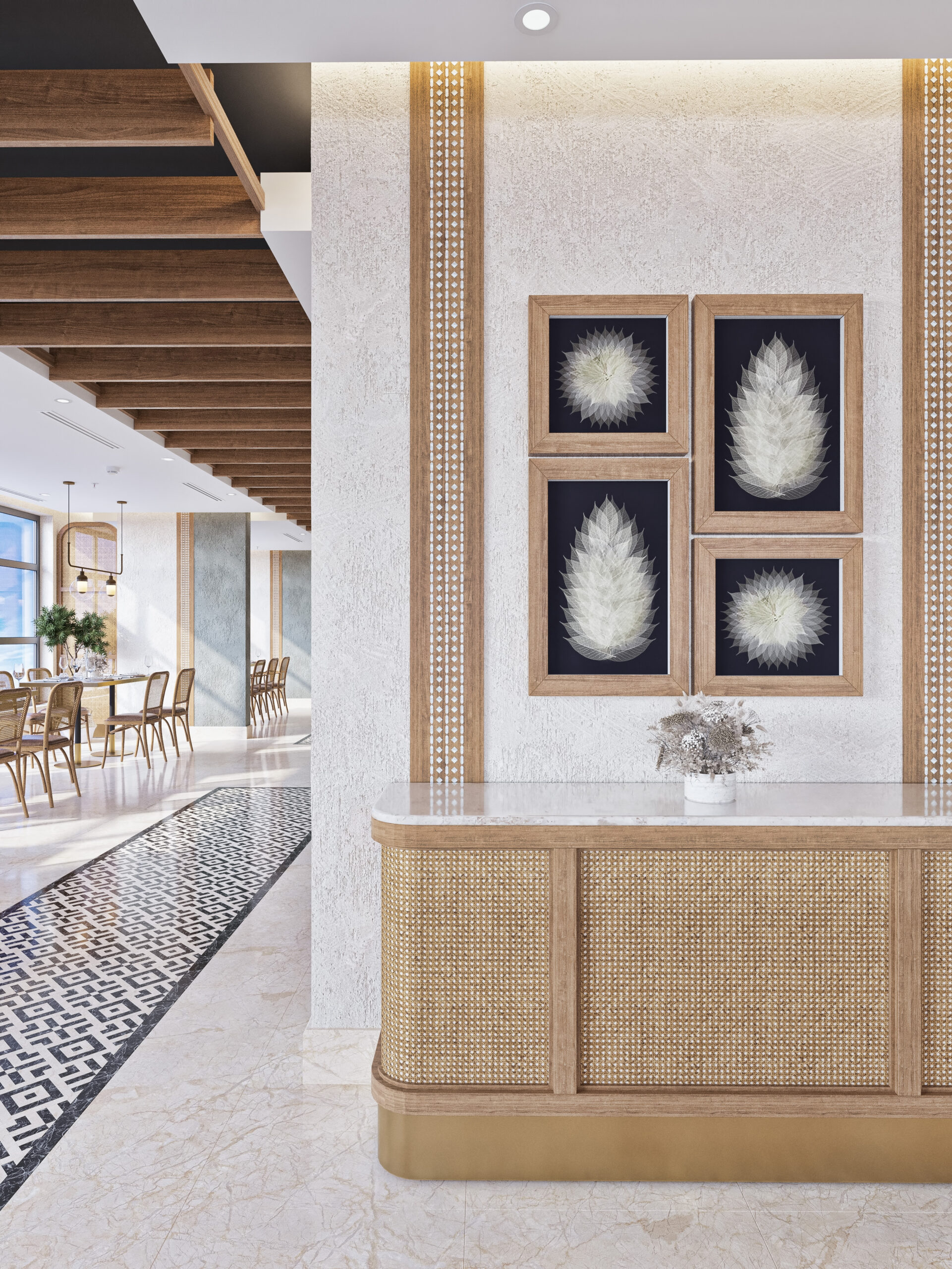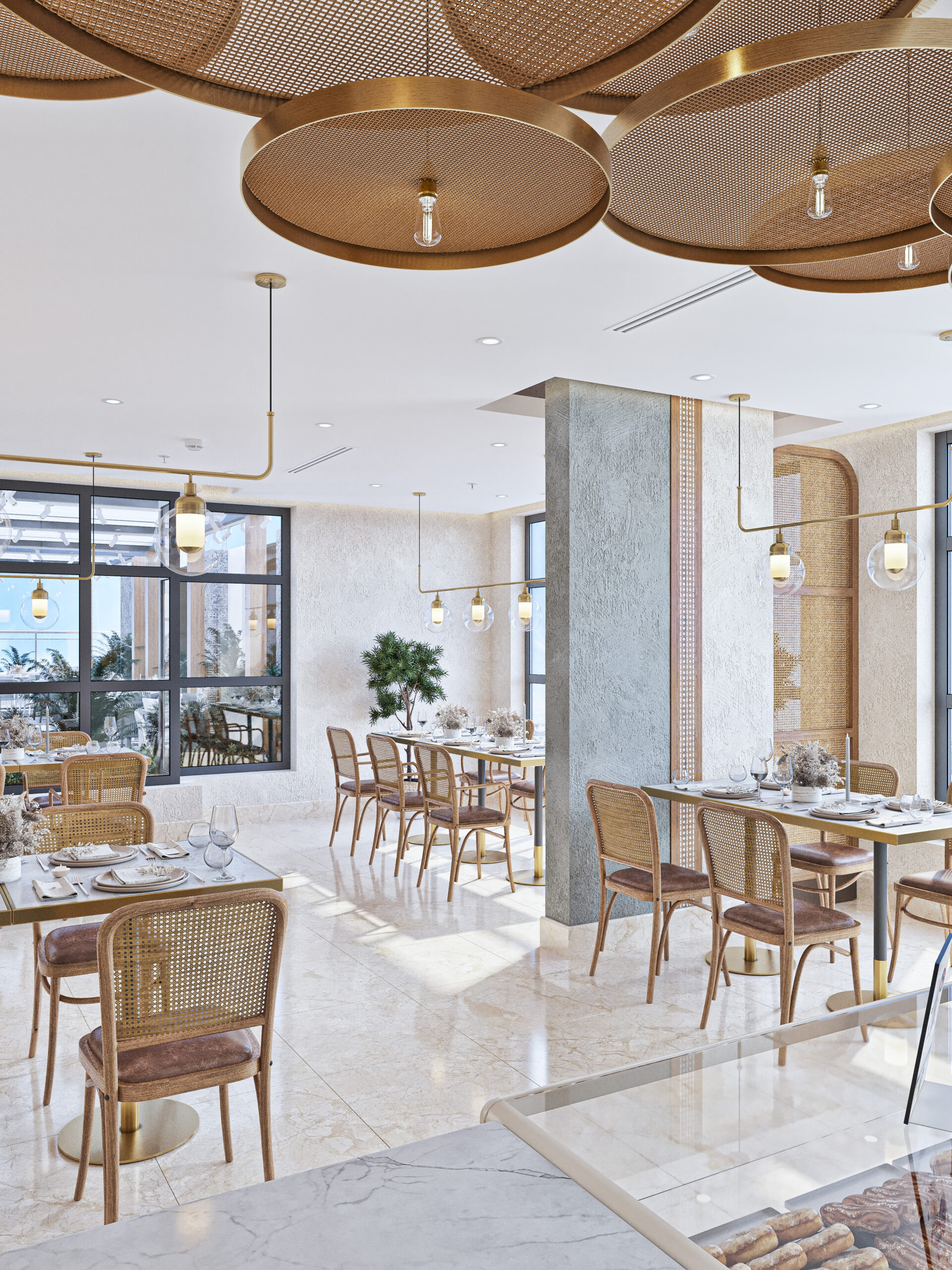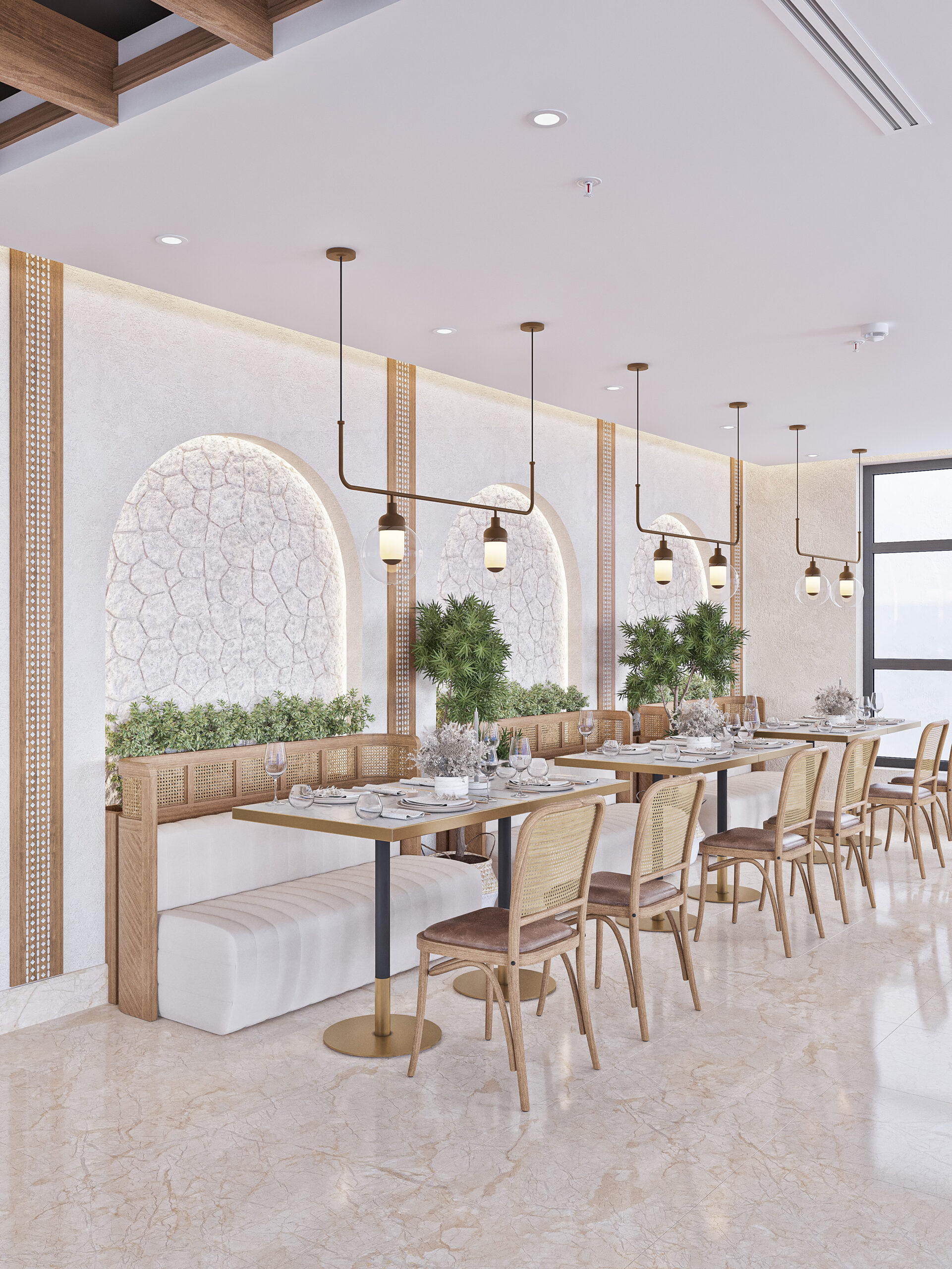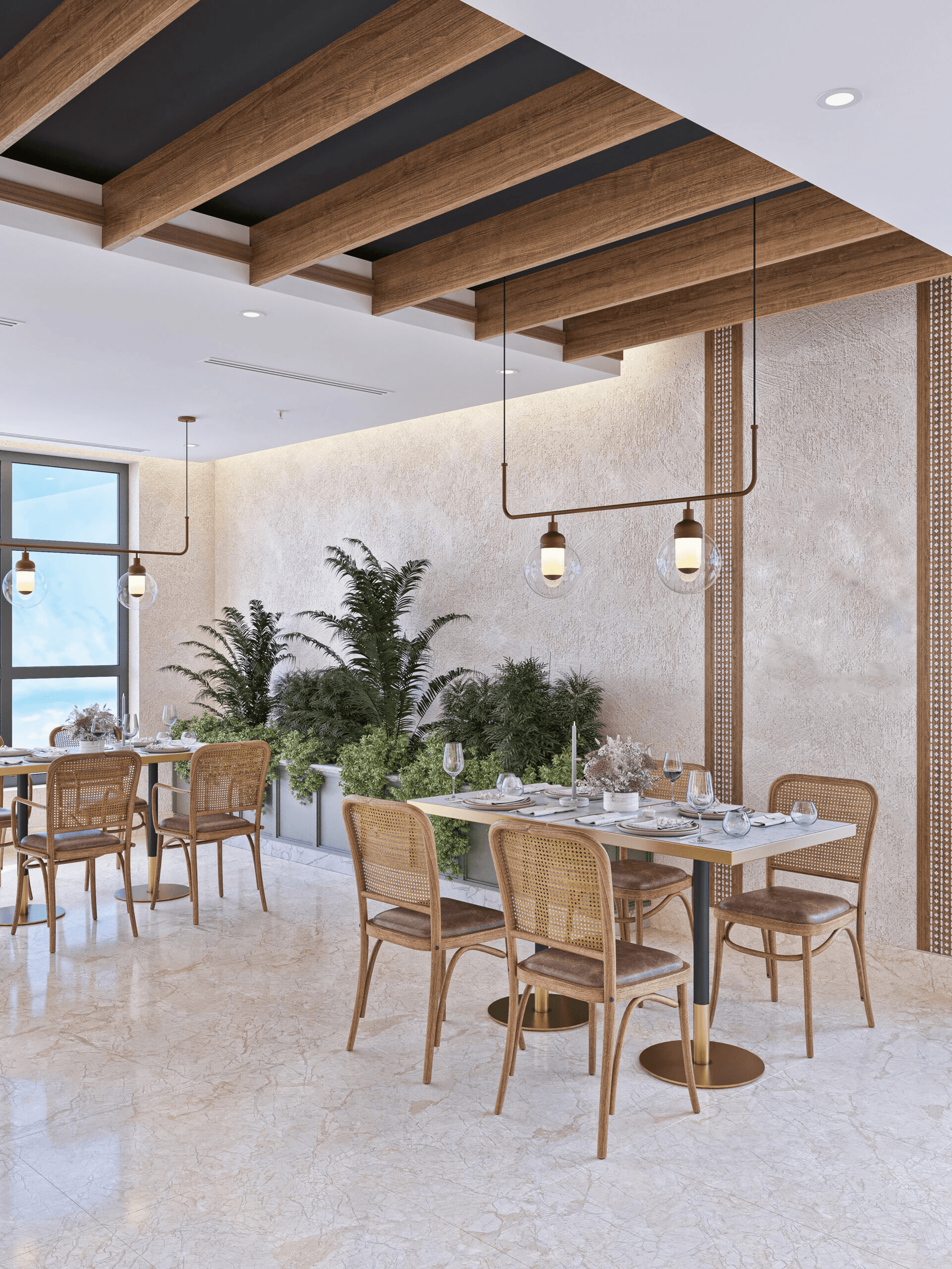 The restaurant has been divided into different spaces, with the use of natural ores such as beige marble for flooring and wooden colors in furniture creating perfect harmony between colors and natural materials, creating a warm and comfortable atmosphere in the restaurant. The luxury umbrella brings a touch of beauty and function, providing shade, sun protection, and weather agents.
