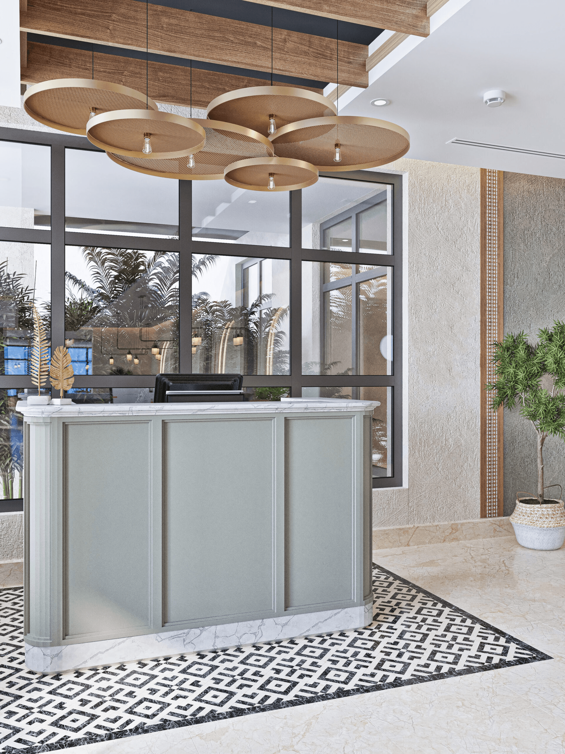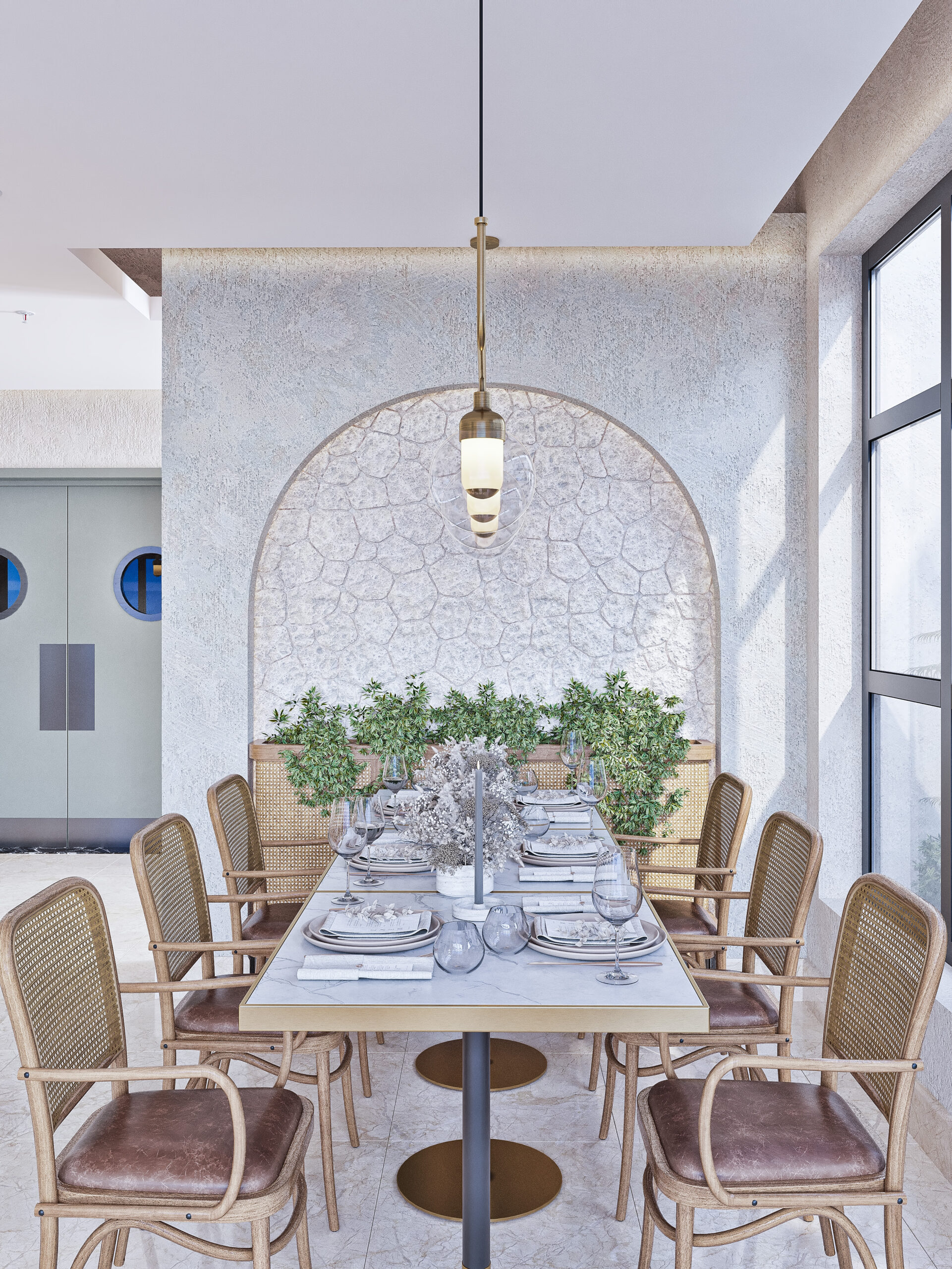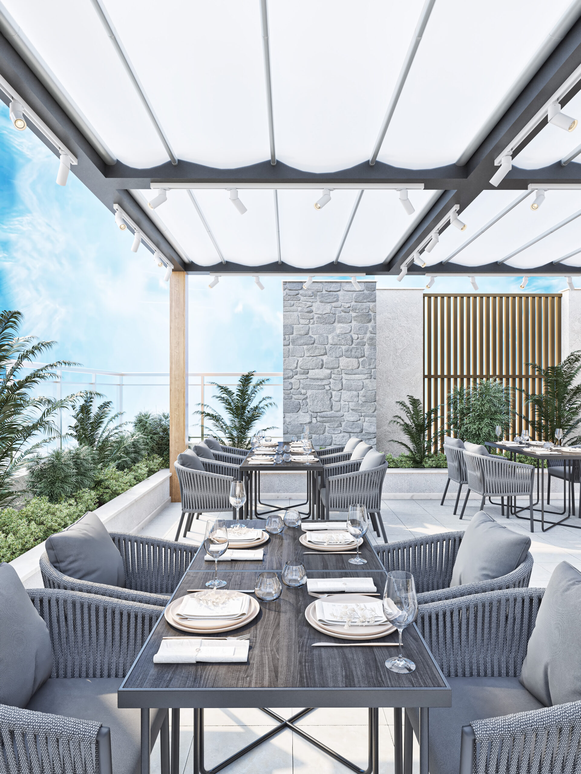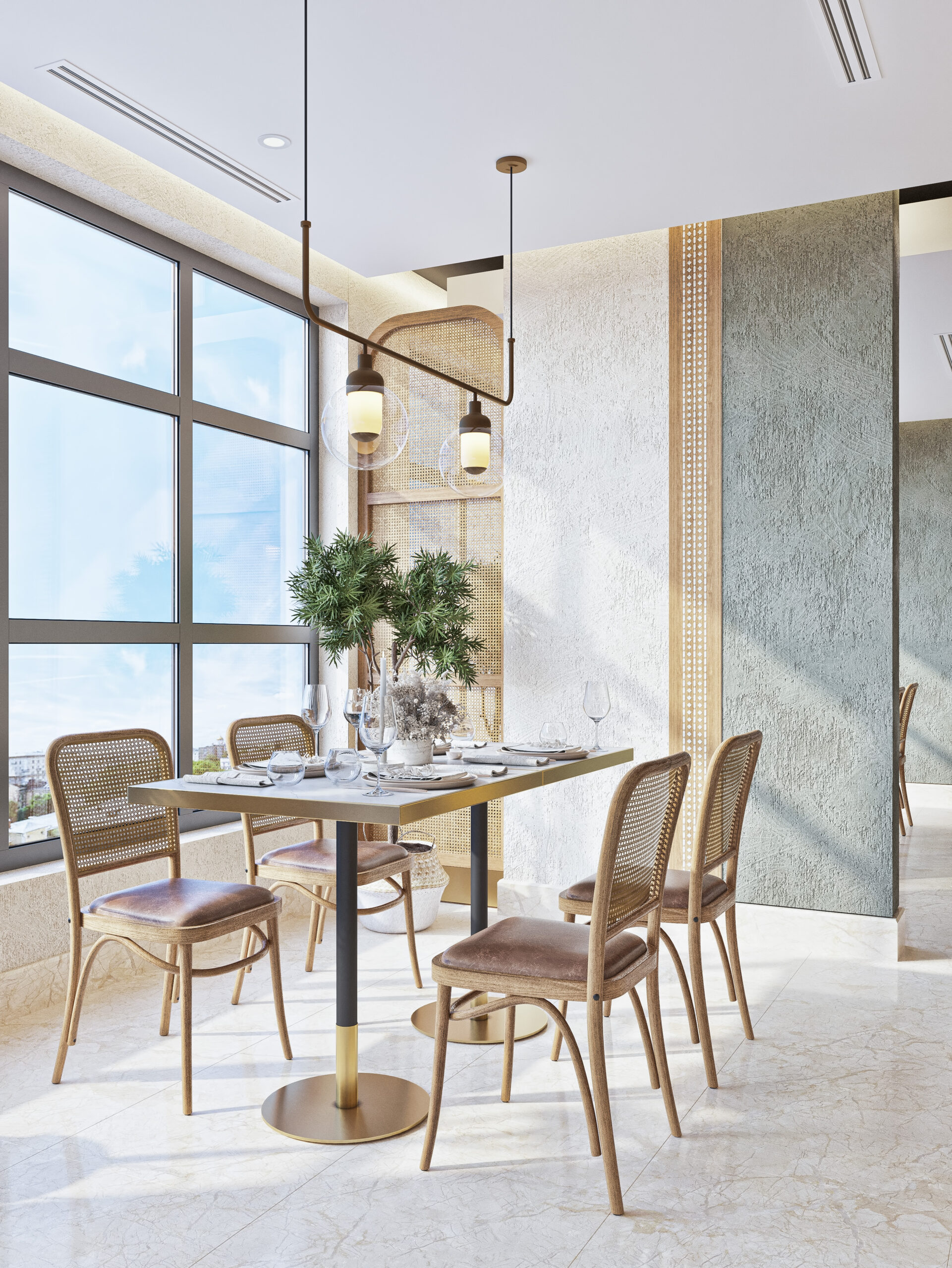 The restaurant has been divided into different spaces, with the use of natural ores such as beige marble for flooring and wooden colors in furniture creating perfect harmony between colors and natural materials, creating a warm and comfortable atmosphere in the restaurant. The luxury umbrella brings a touch of beauty and function, providing shade, sun protection, and weather agents.