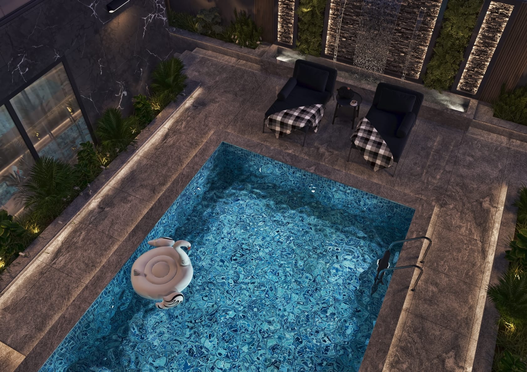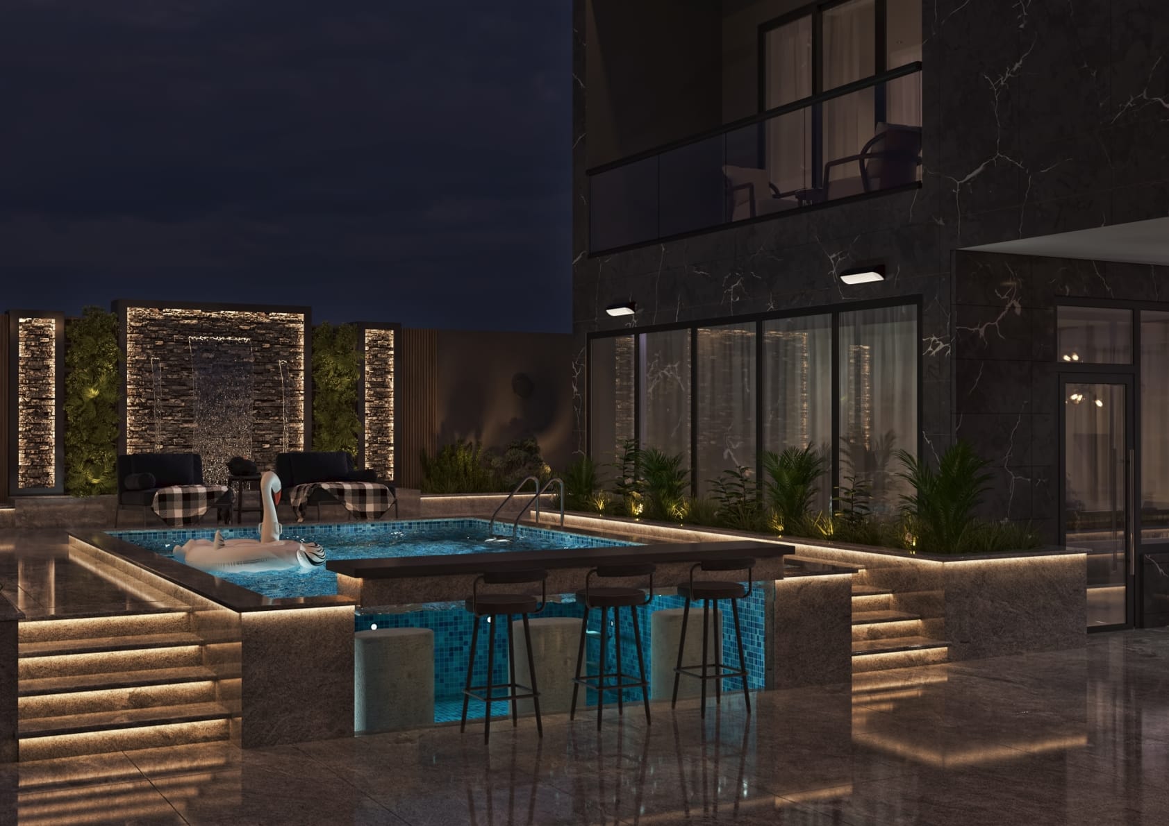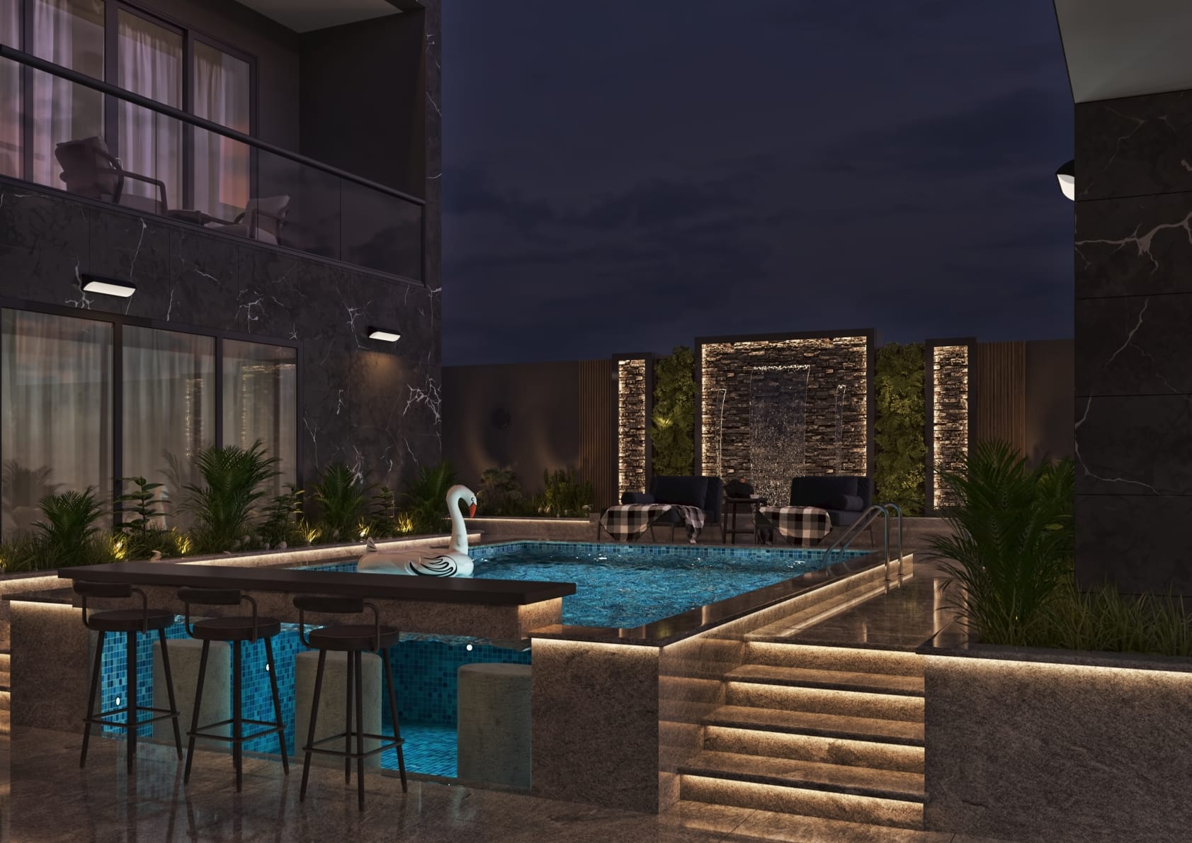 Appropriate lighting contributes to creating a glamorous atmosphere at night and exquisitely highlights the beautiful details of the villa, where dim lighting and directed lighting are used for a spectacular view and a sense of luxury.