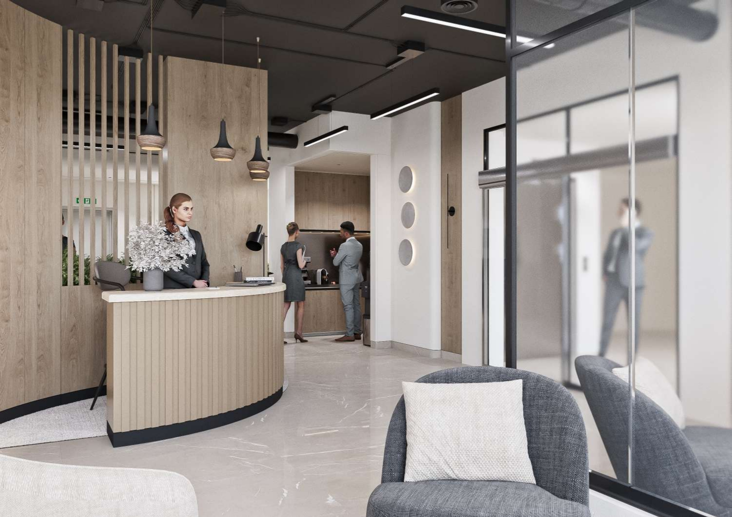 Expansive glass partitions create an open, airy atmosphere while defining distinct work zones, featuring ergonomic desks, high-backed chairs, and integrated planters that add a touch of nature to the workspace. A sophisticated lobby welcomes visitors with plush seating, a polished marble floor, and a minimalist reception desk, blending modern elegance with warm hospitality. Architectural details like exposed ceiling pipes, ambient lighting, and wooden accents enhance the industrial-chic vibe, fostering a creative yet focused atmosphere. From private meeting areas to communal lounges, every space is thoughtfully designed to encourage collaboration, efficiency, and well-being in a dynamic urban setting.