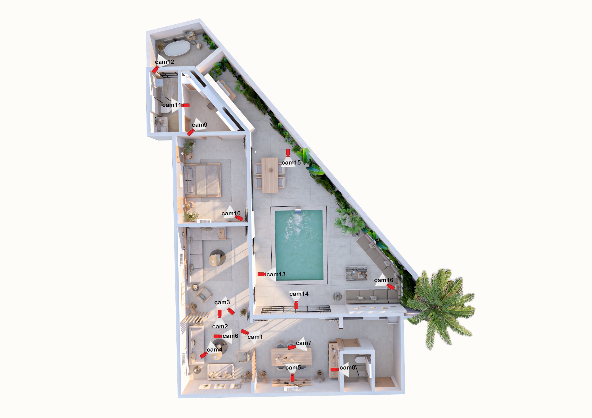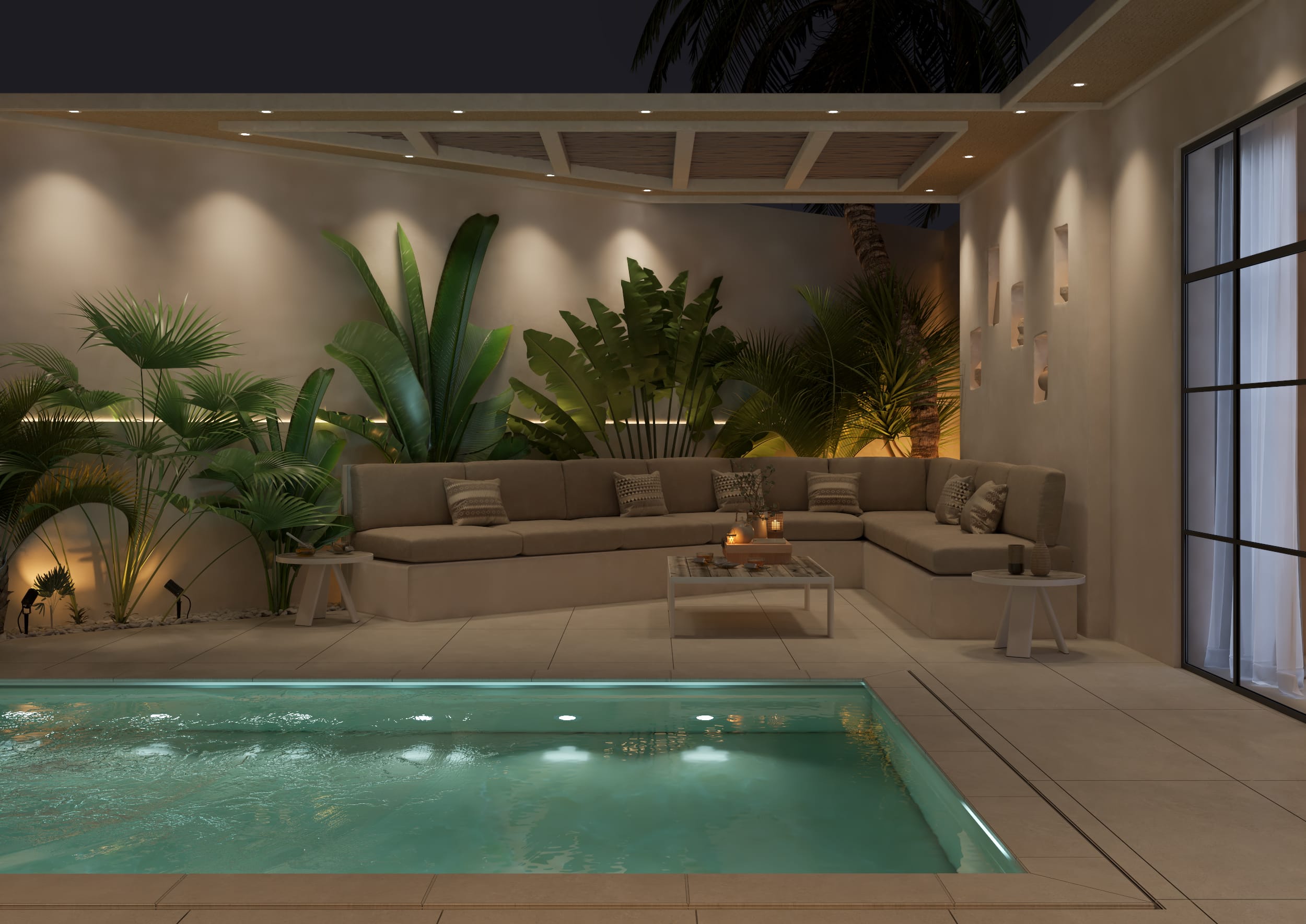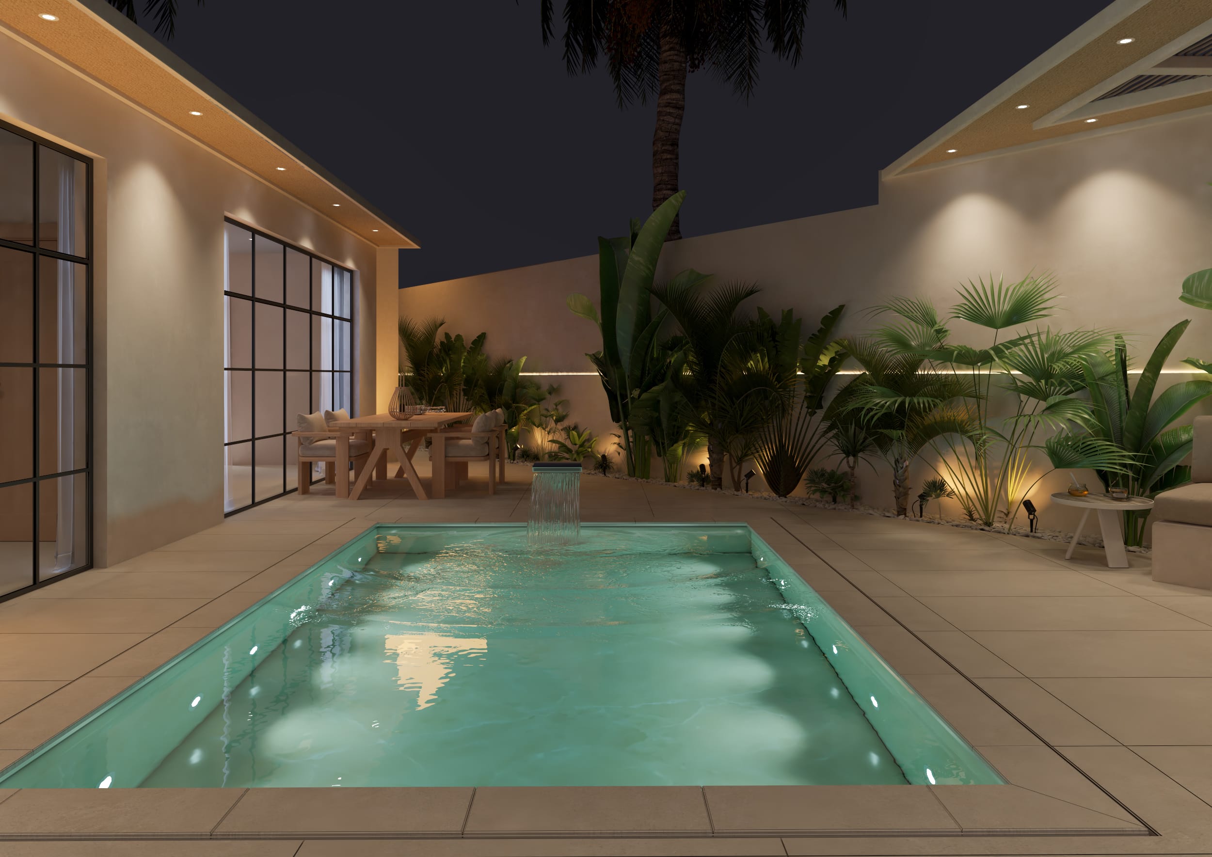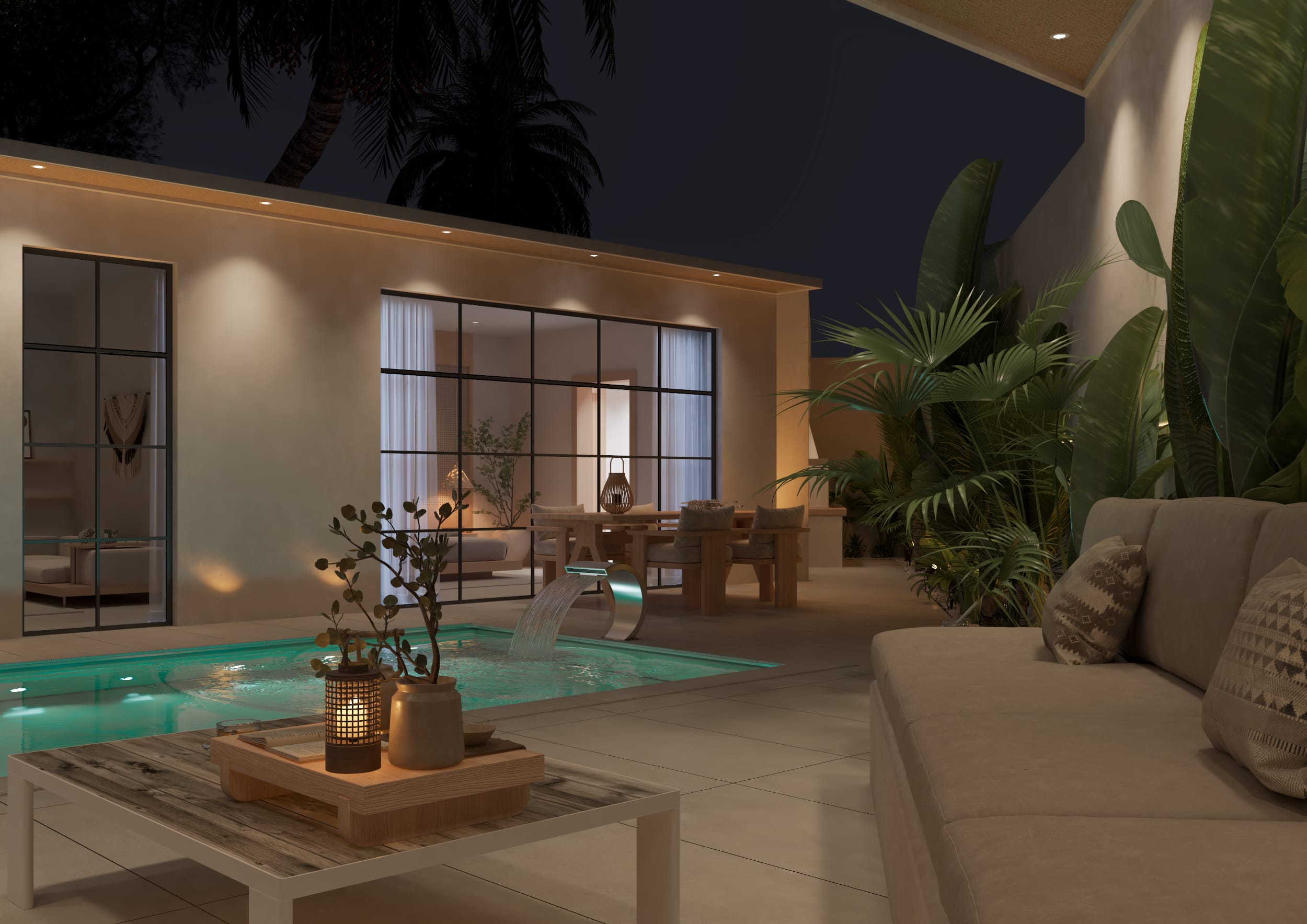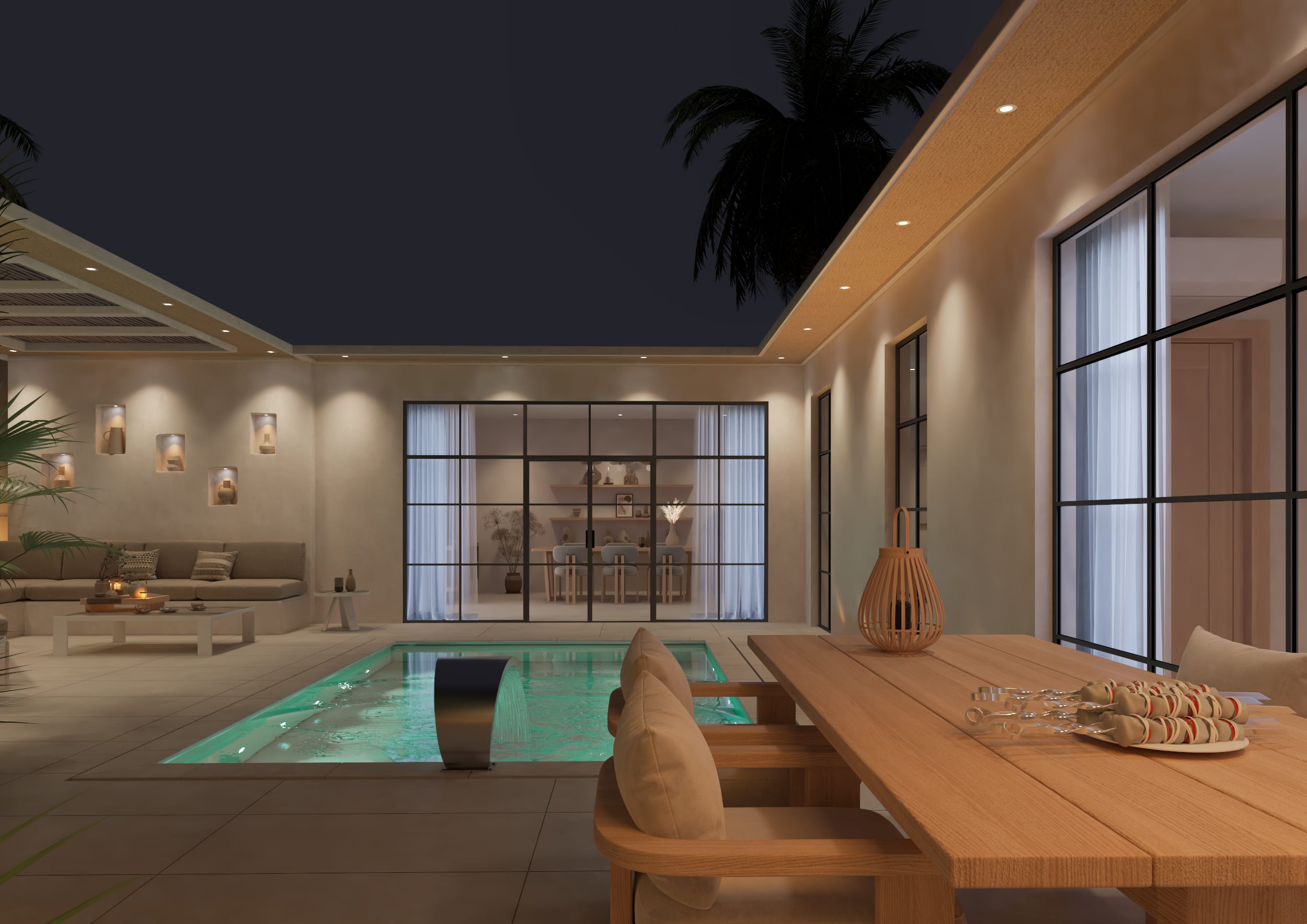 Expansive glass doors frame a vibrant courtyard centered around a crystal-clear swimming pool, flanked by cascading waterfalls and lush palm trees that create a secluded paradise. The interiors boast minimalist aesthetics with neutral-toned furnishings, woven accents, and ambient lighting that enhance the seamless flow between the dining area, lounge, and alfresco seating. At night, strategically placed lanterns and wall sconces illuminate the outdoor seating and poolside areas, transforming the space into a romantic, starlit oasis. Every detail—from the textured stone flooring to the curated greenery—reflects a harmonious balance of modern sophistication and natural serenity.