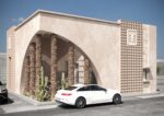 The Alban project blends contemporary architecture with organic textures, featuring an exterior defined by a sweeping beige arch, geometric brick patterns, and a striking goat-head logo that nods to cultural heritage.