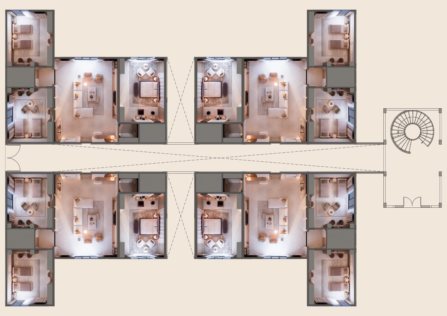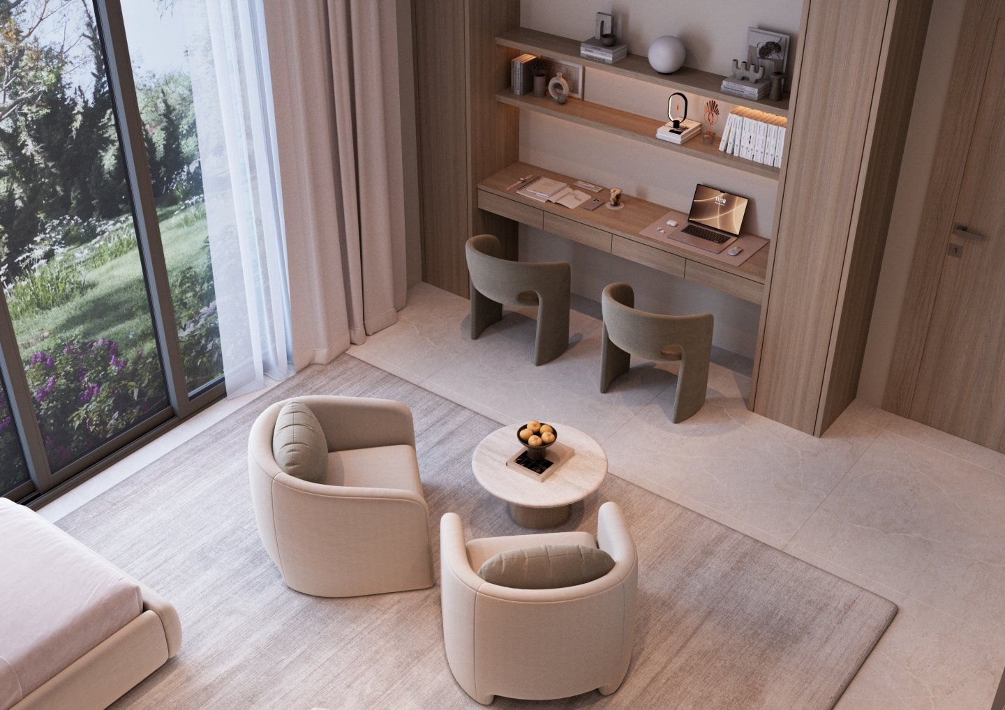 يتميز تراسه الخارجي بعريشة خشبية خلابة، وجدار مائي متدفق مُحاط بخشب داكن، ومناطق جلوس حميمة مُضاءة بإضاءة دافئة مخفية، مما يوفر ملاذًا هادئًا. في الداخل، تزين ألواح خشبية منحوتة بدقة، مزينة بأشكال هندسية، الجدران، مُكملةً النوافذ المقوسة والمقاعد الفخمة المُنجدة بأقمشة رقيقة بنقش دمشقي. تتميز مساحة المعيشة الفخمة بسقف مرتفع، وأرضيات رخامية، ودرج أنيق بسور معدني مزخرف، مما يُضفي عليها لمسة من الفخامة. تعكس كل تفصيلة، من الأجواء الخارجية البسيطة إلى التصميمات الداخلية الغنية بالملمس، توازنًا دقيقًا بين الابتكار والتراث، مما يُنشئ مساحة معيشة فاخرة ومتجذرة في التراث.